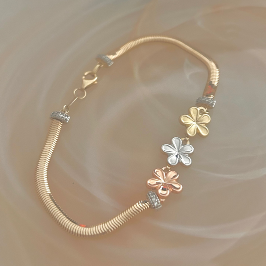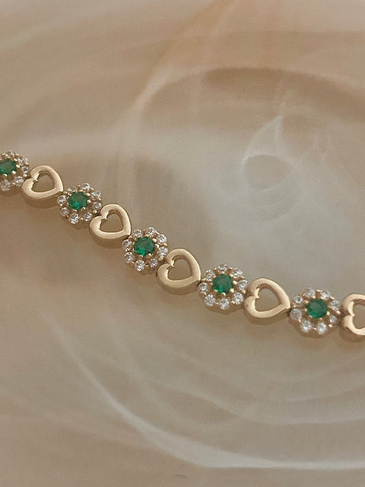 Pulsera Corazones y Flores Esmeralda en Oro 14K