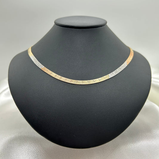 Conjunto Collar y Aretes en 3 Oros Tejido Panza de Víbora