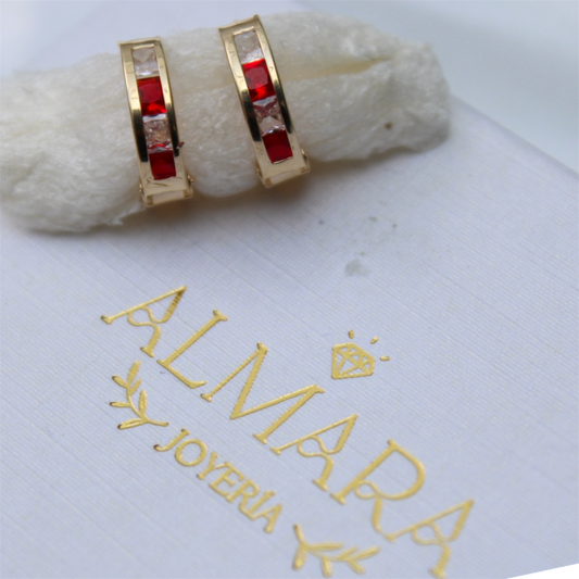 Huggies en Oro 10K con Zirconias Rojas y Blancas