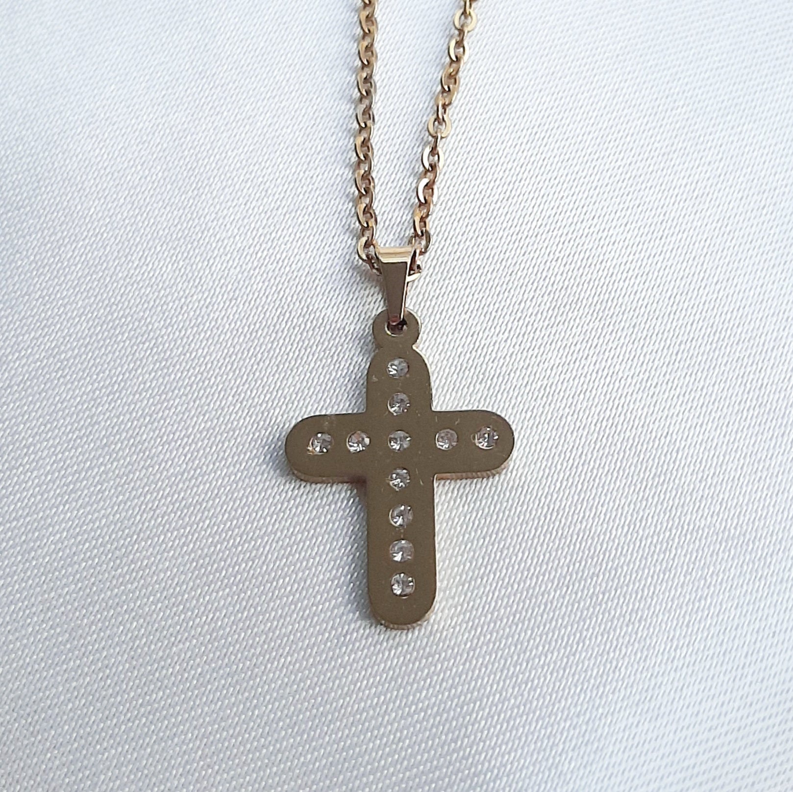 Bonito collar con cruz con zirconias de acero inoxidable en tono dorado, para ese look casual.