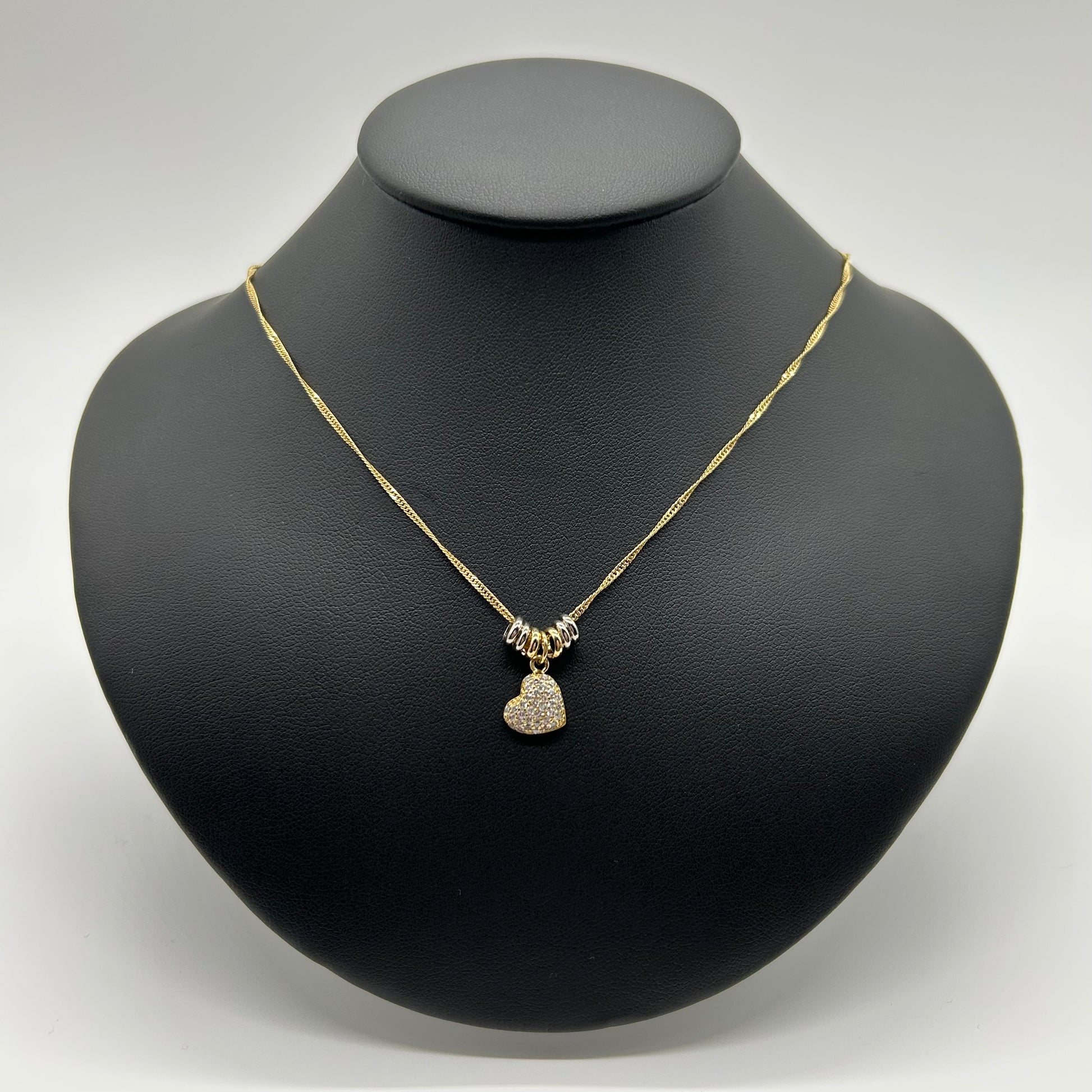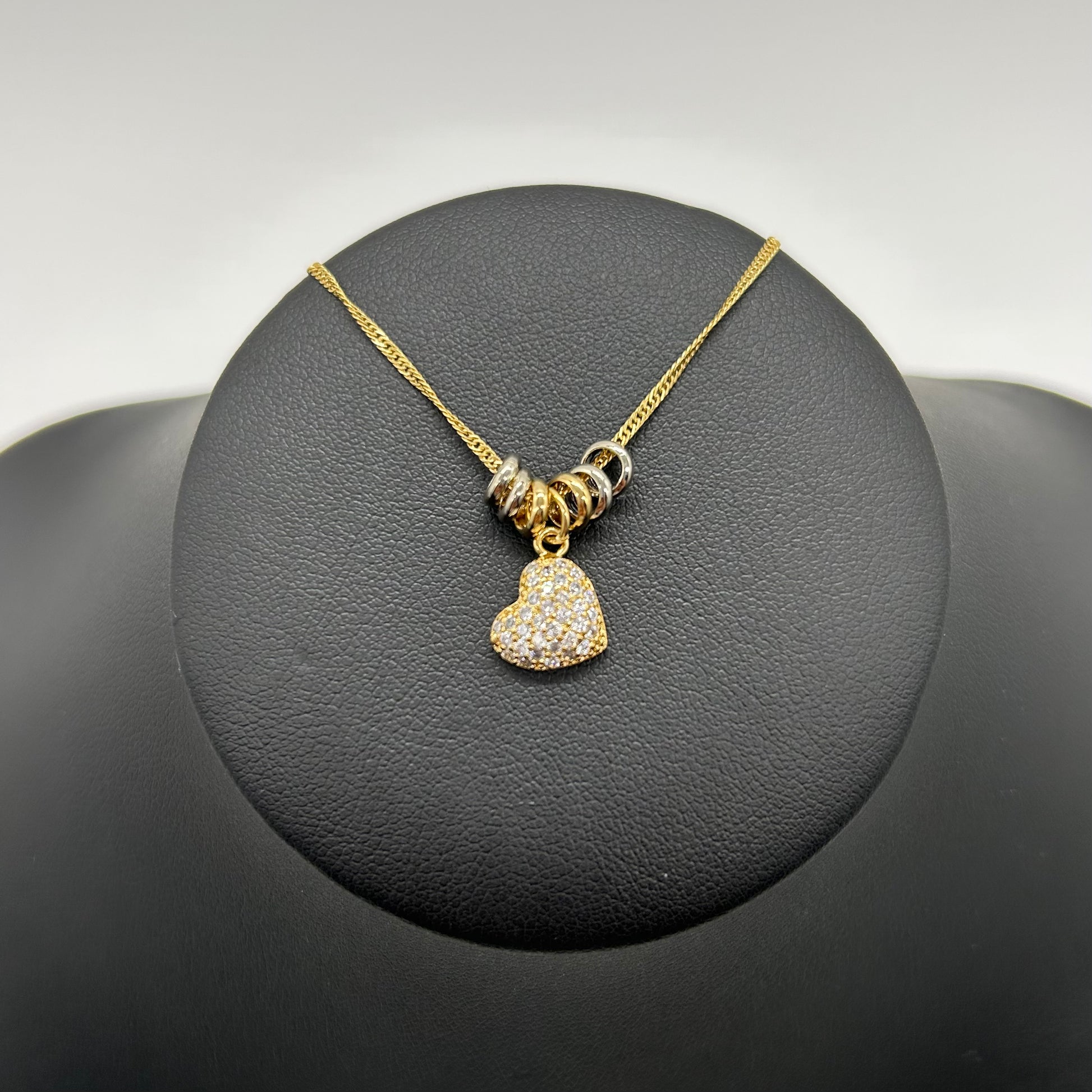 Llévate el amor siempre contigo con nuestro collar de corazón de oro laminado. Con circonitas incrustadas y aritos, este accesorio es perfecto para cualquier ocasión. Un detalle romántico que complementa cualquier outfit.