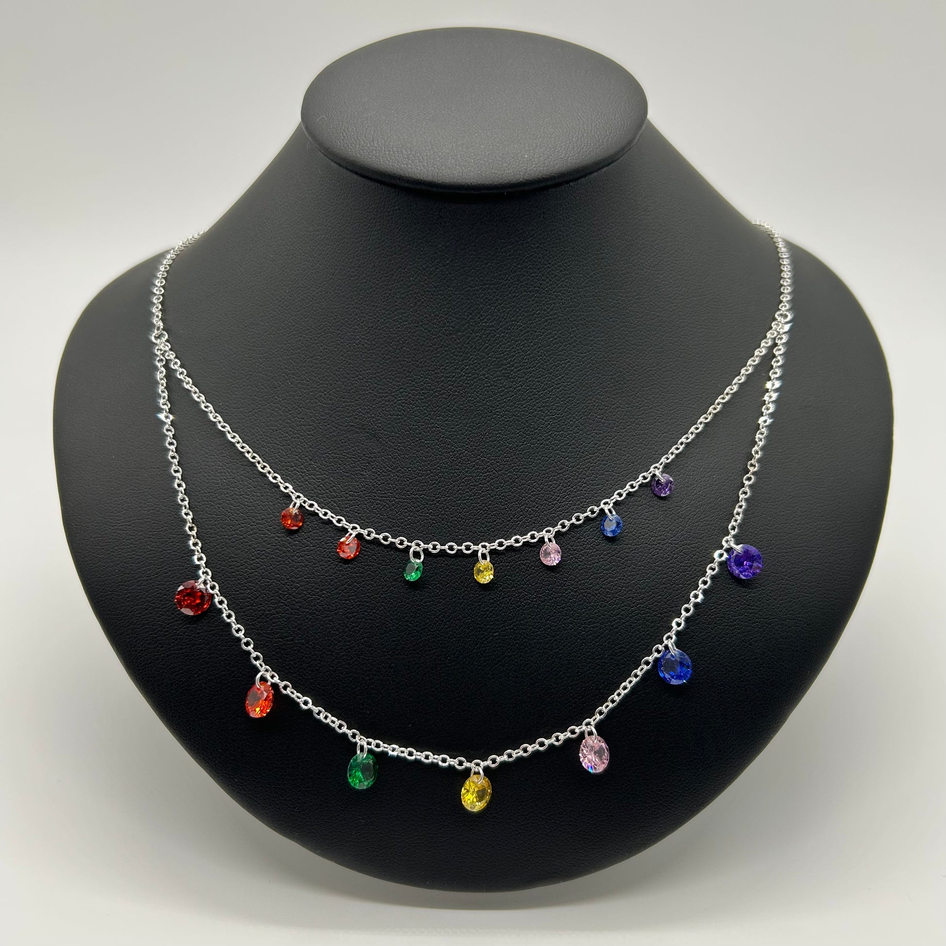¡Añade un toque de color y brillo a tu estilo con nuestro collar doble de plata! Con zirconias de diferentes colores, este collar es perfecto para alegrar cualquier atuendo.