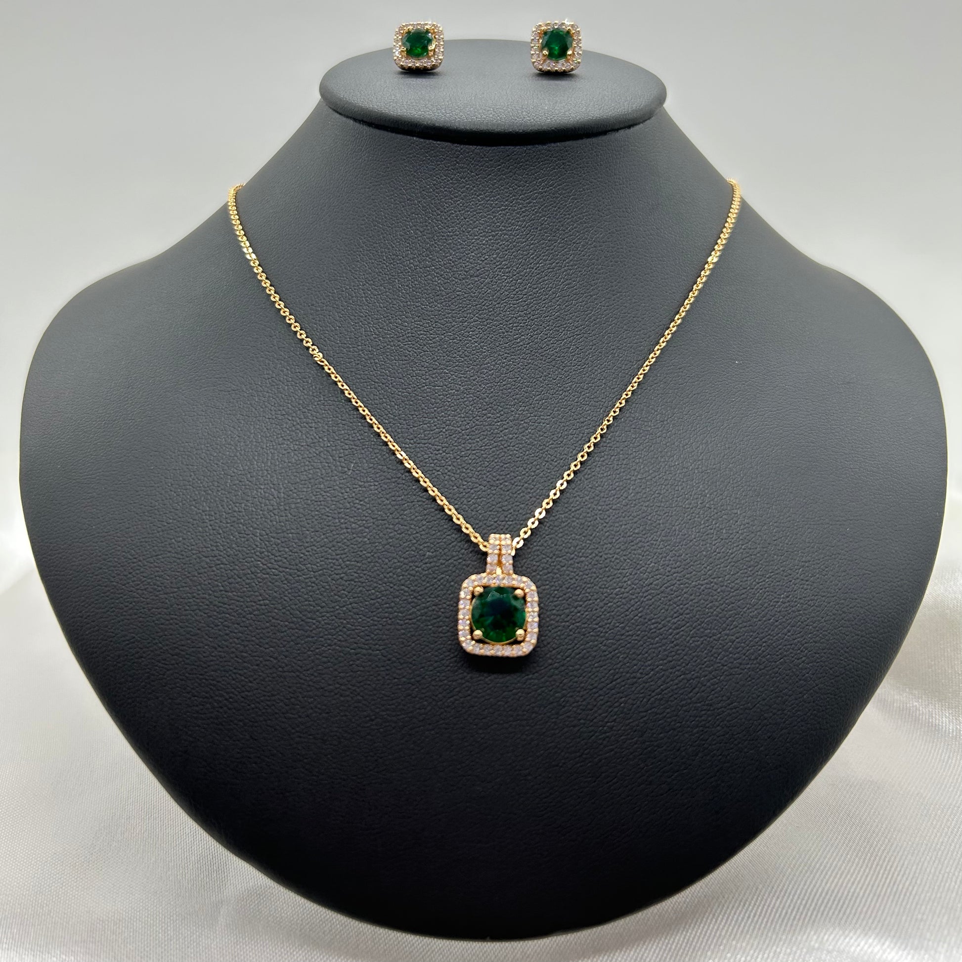 Elegante conjunto de collar y aretes de oro laminado con detalles de zirconias verdes.