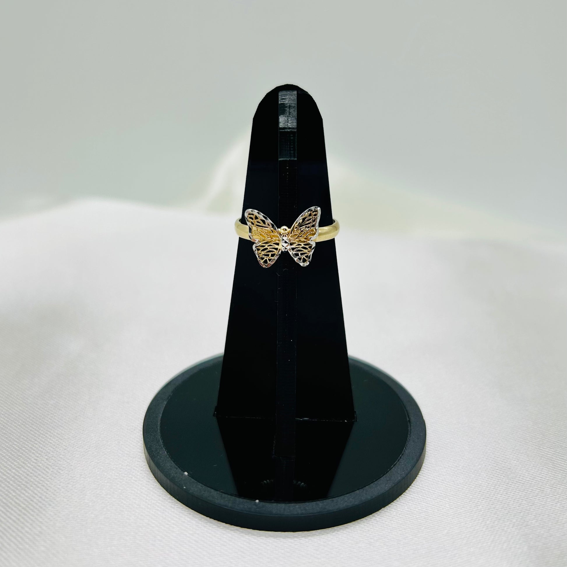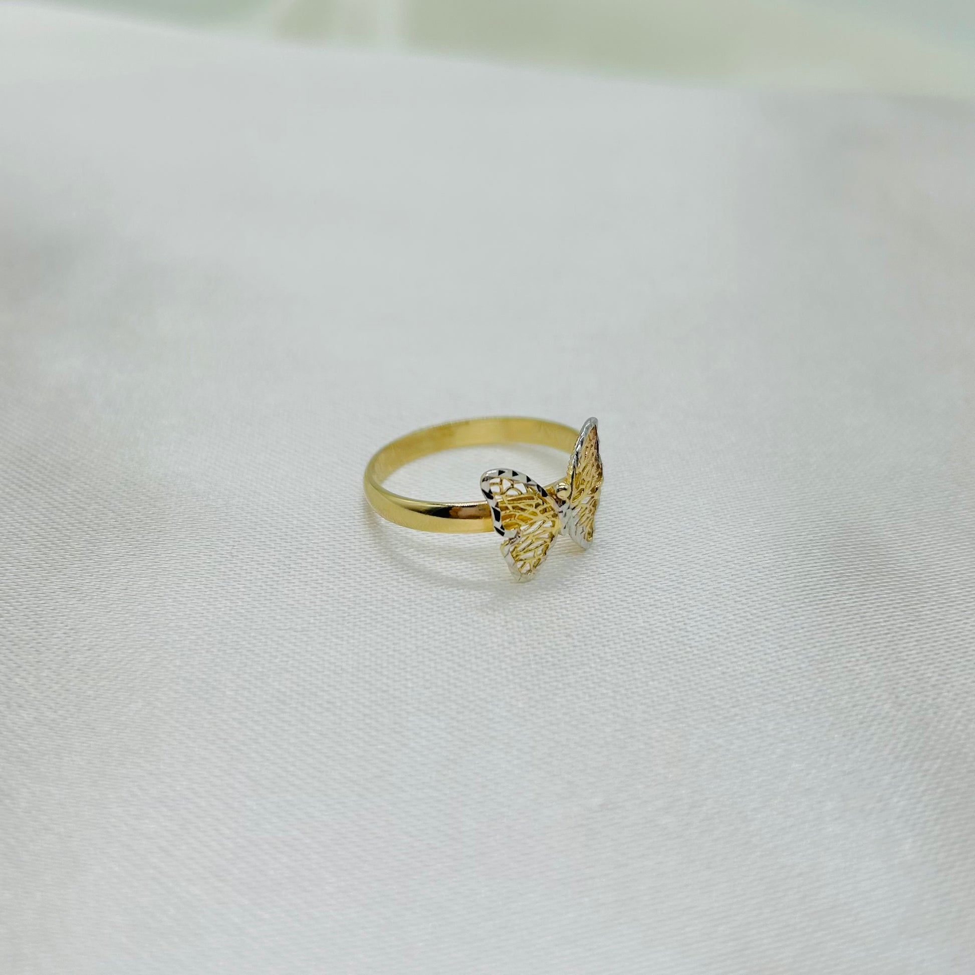 Hermoso anillo de mariposa diamantado en dos oros de 10K