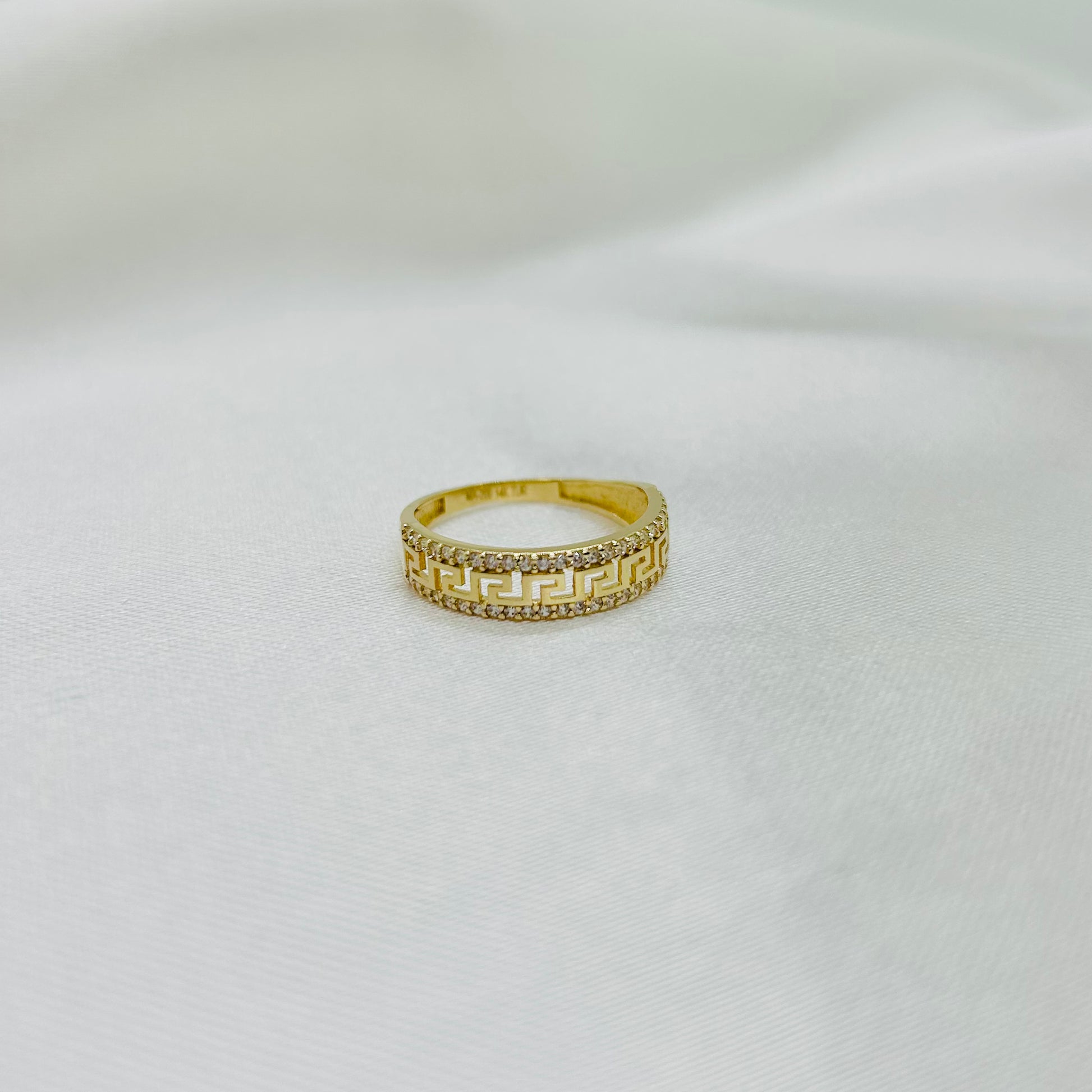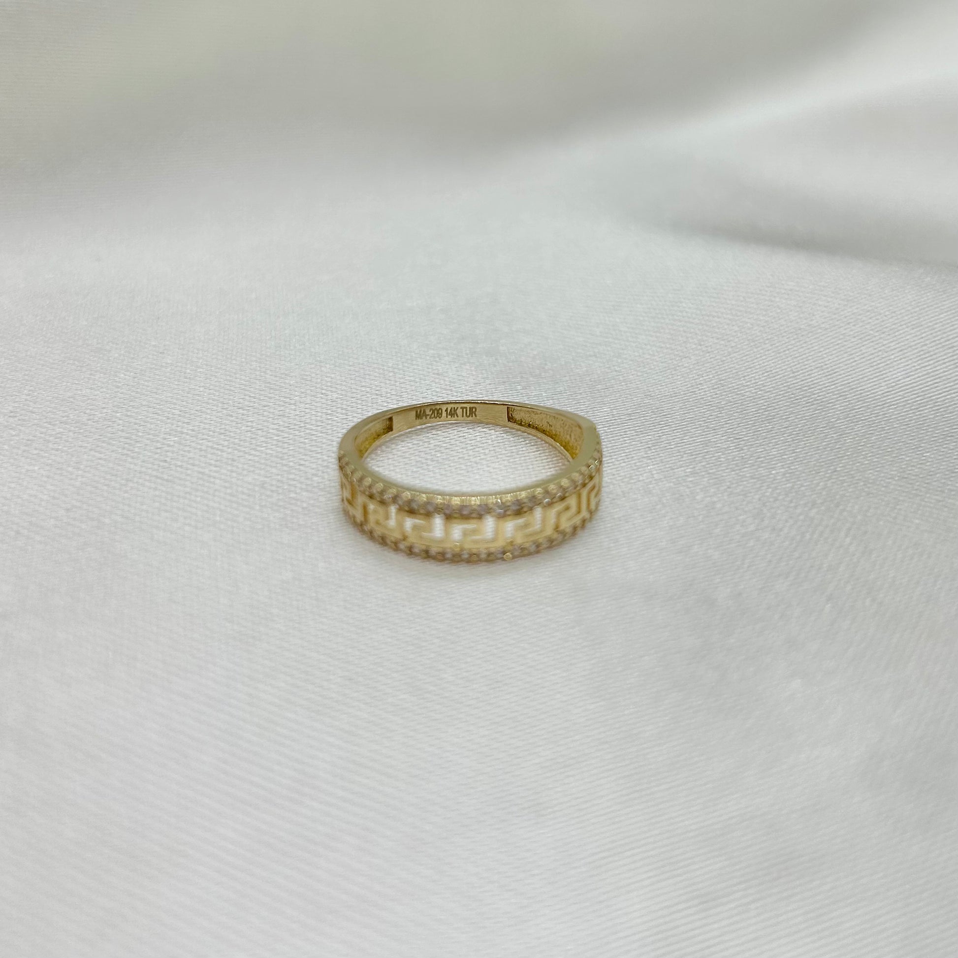 Hermoso anillo de grecas con detalles en circonitas de oro de 14K