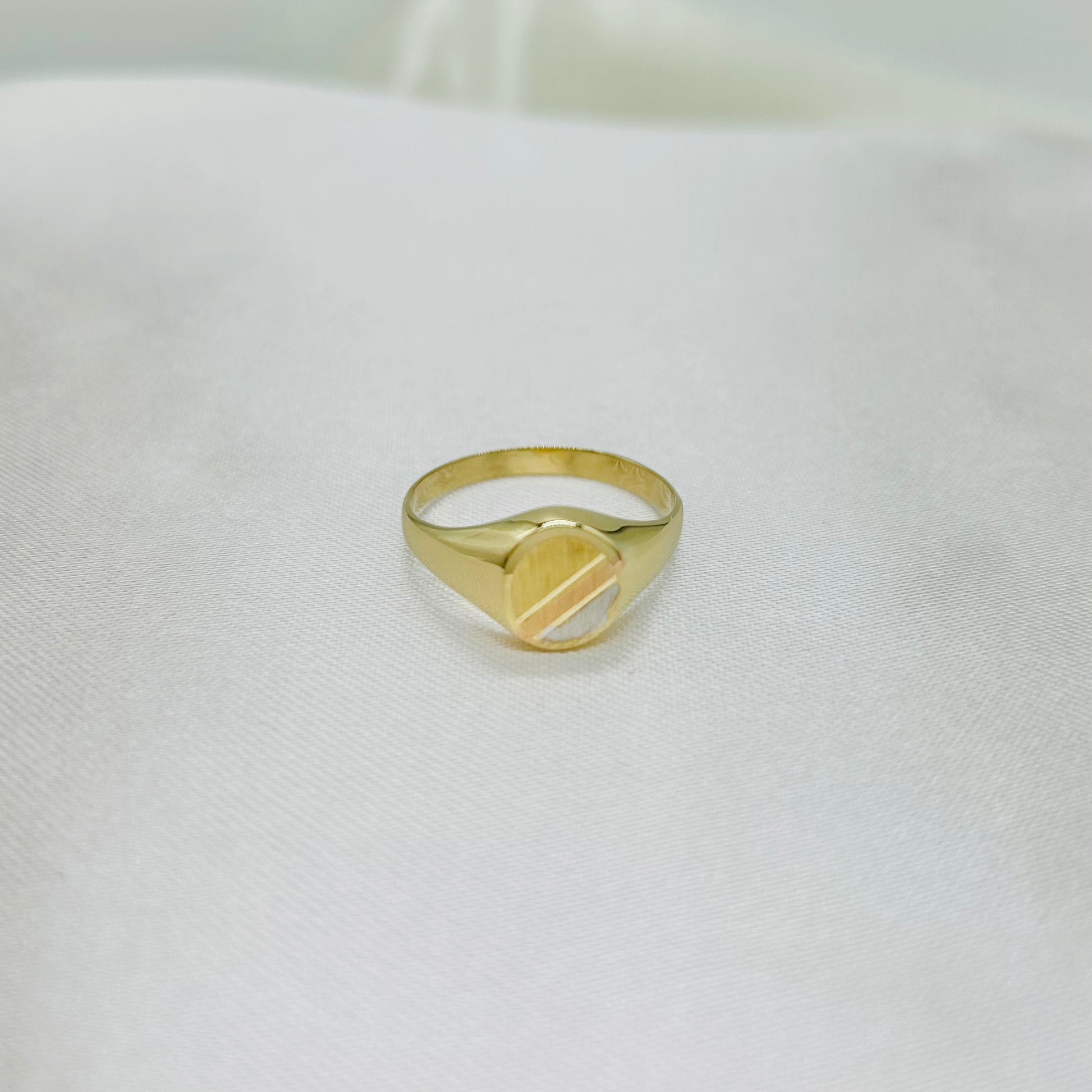 Hermoso anillo de plancha combinado en tres oros de 10K