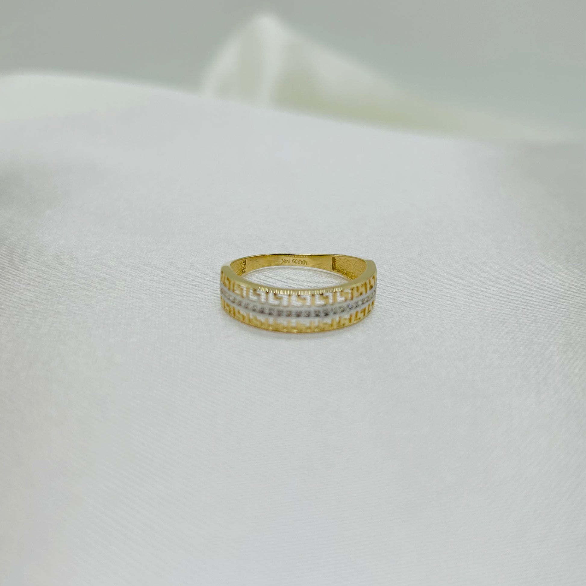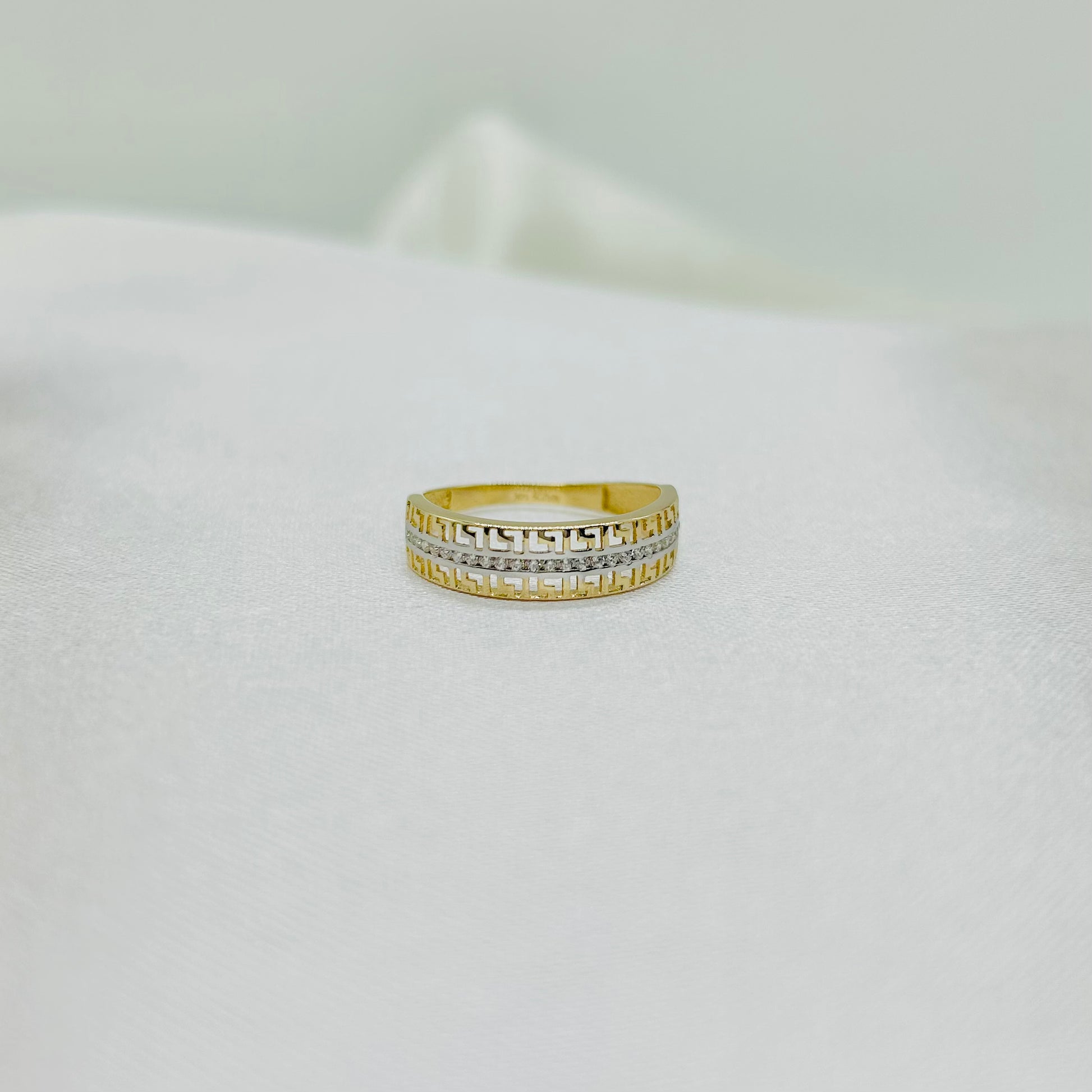 Hermoso anillo de grecas con detalles en circonitas de oro de 14K