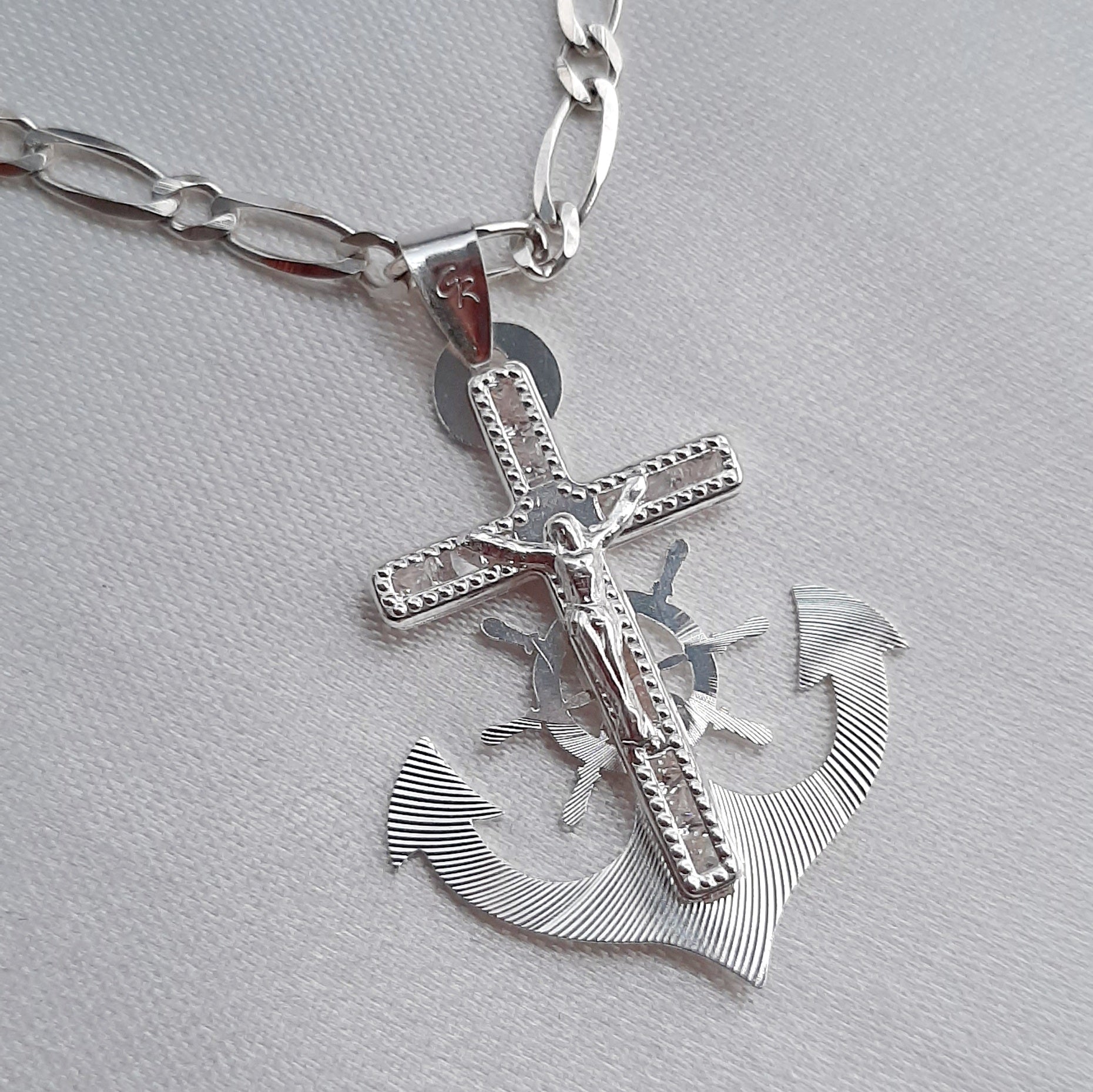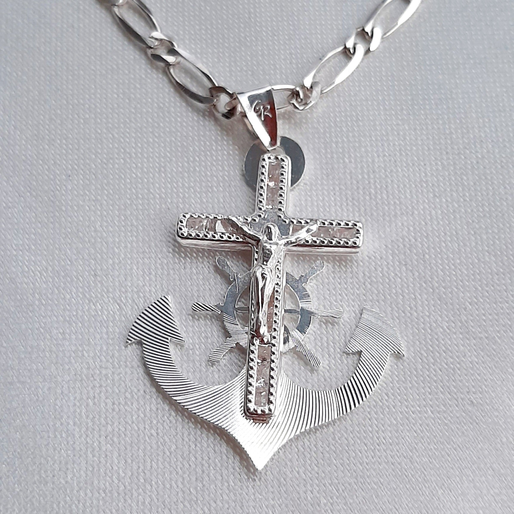 Elegante dije de plata en forma de ancla con cruz e incrustaciones de zirconias , agregando sofisticación a tu look.