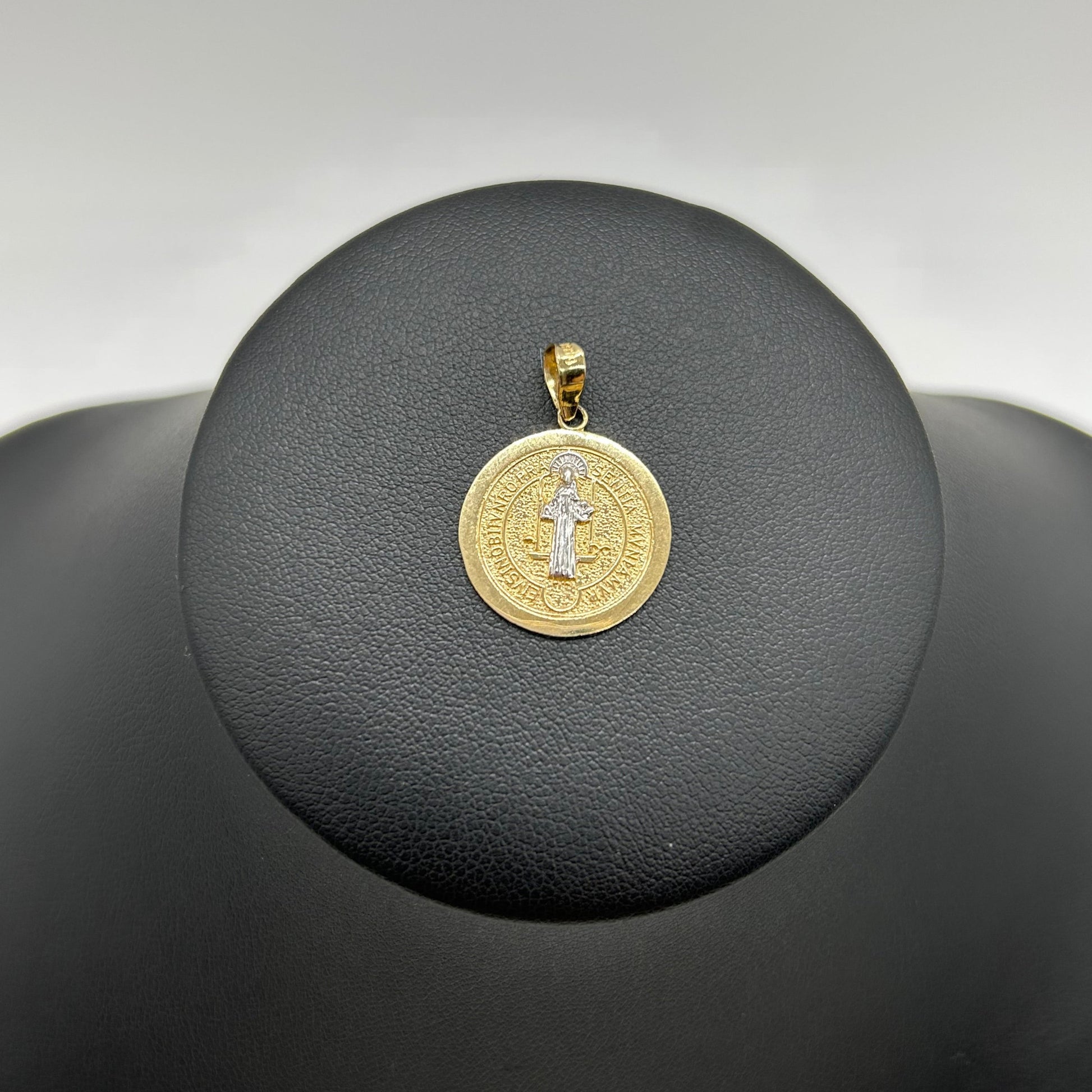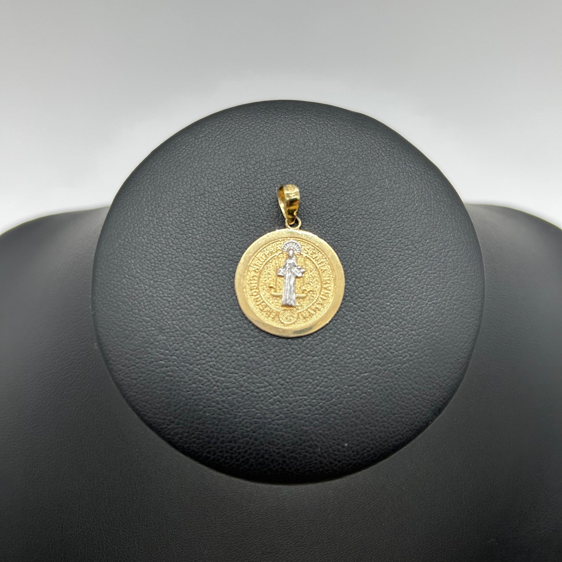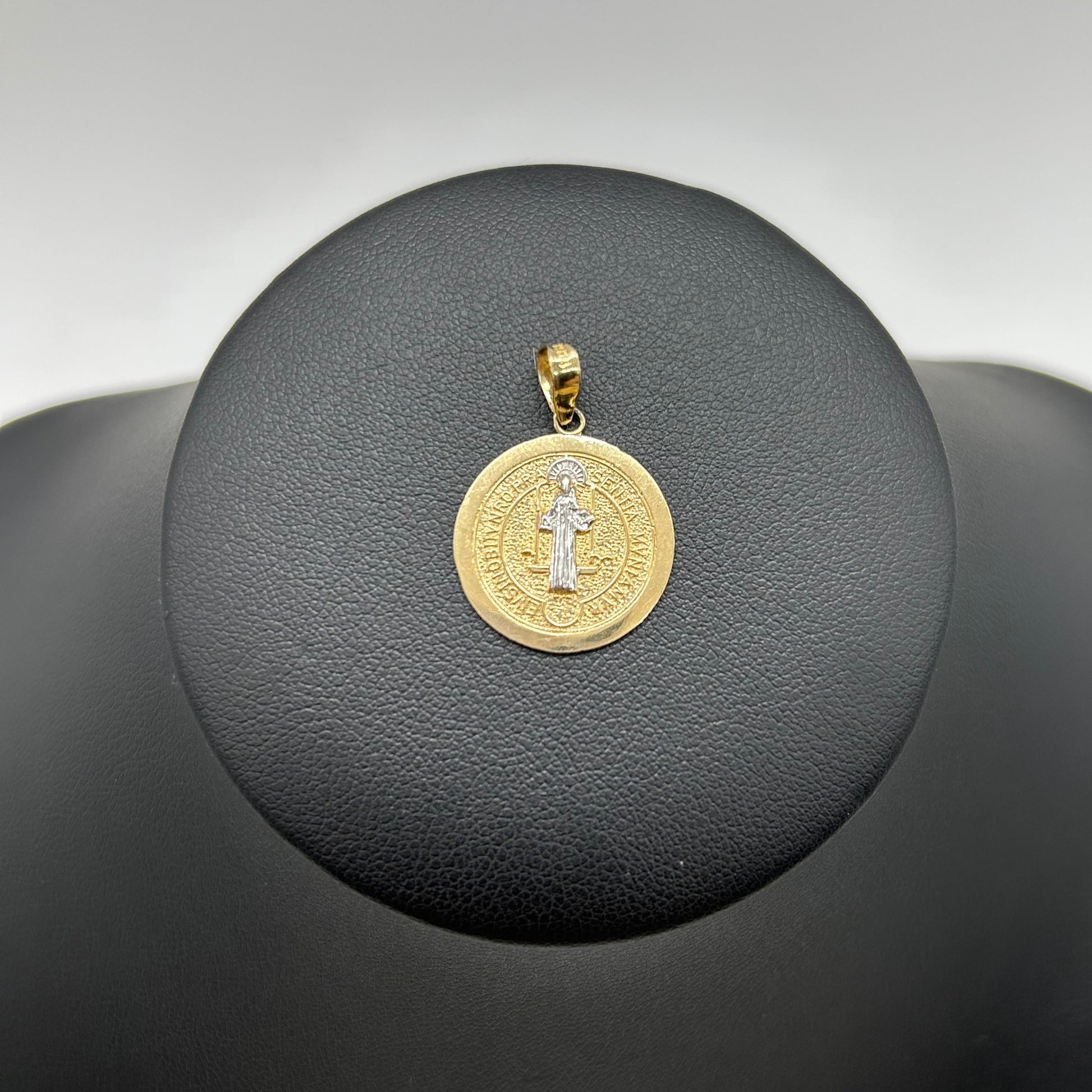 Hecho de oro 14k, este dije representa la fe y la protección de San Benito en dos elegantes lados. Una pieza única que te acompañará siempre.