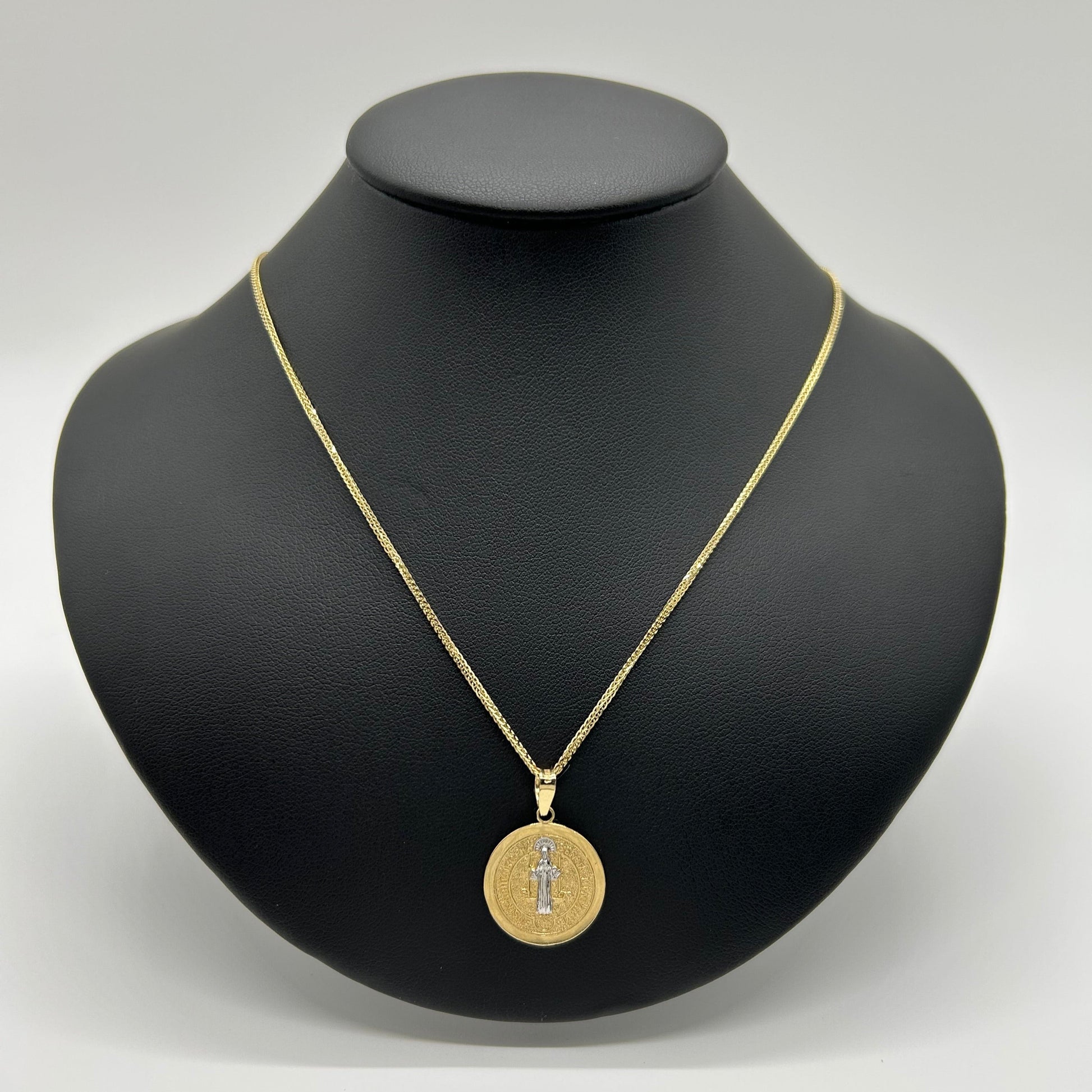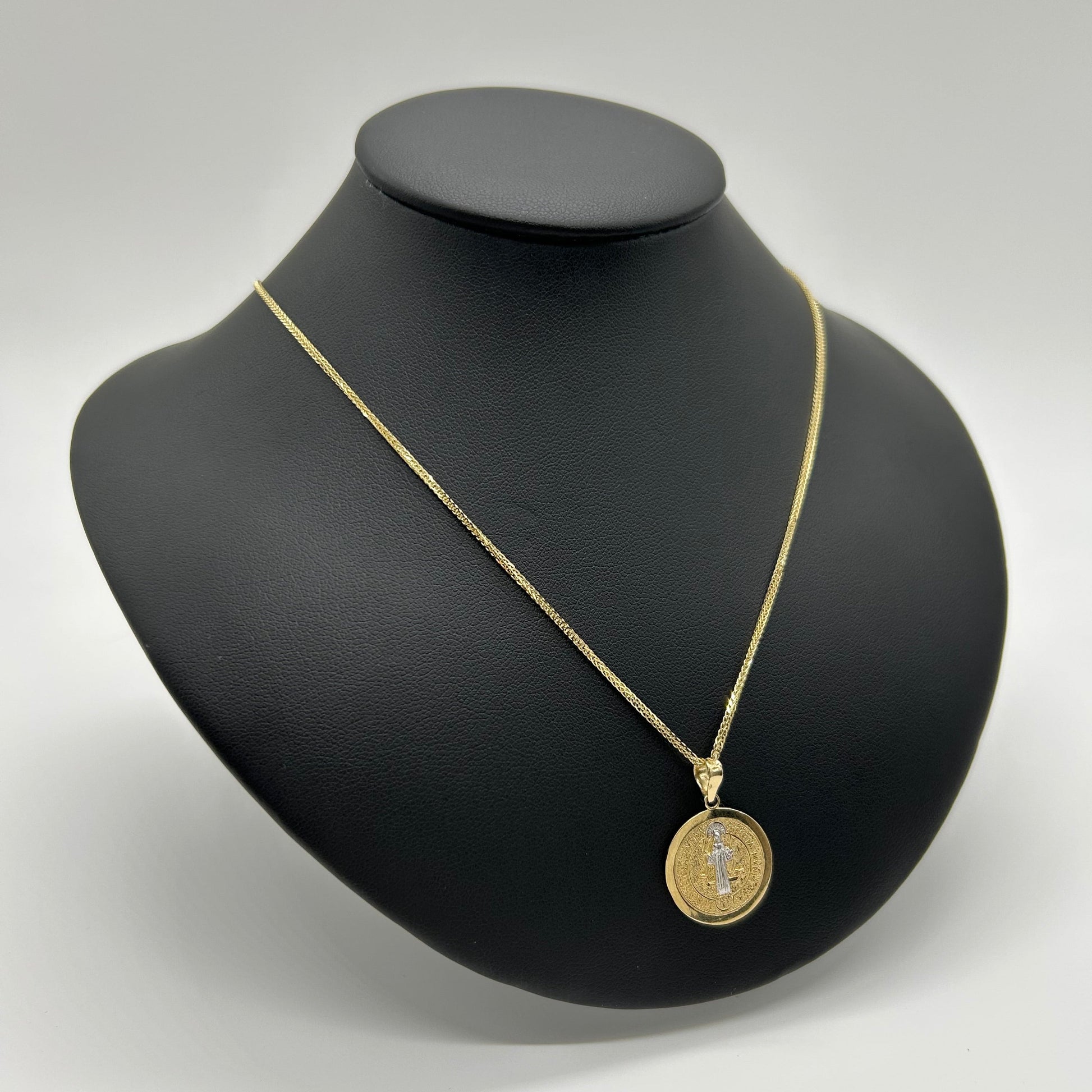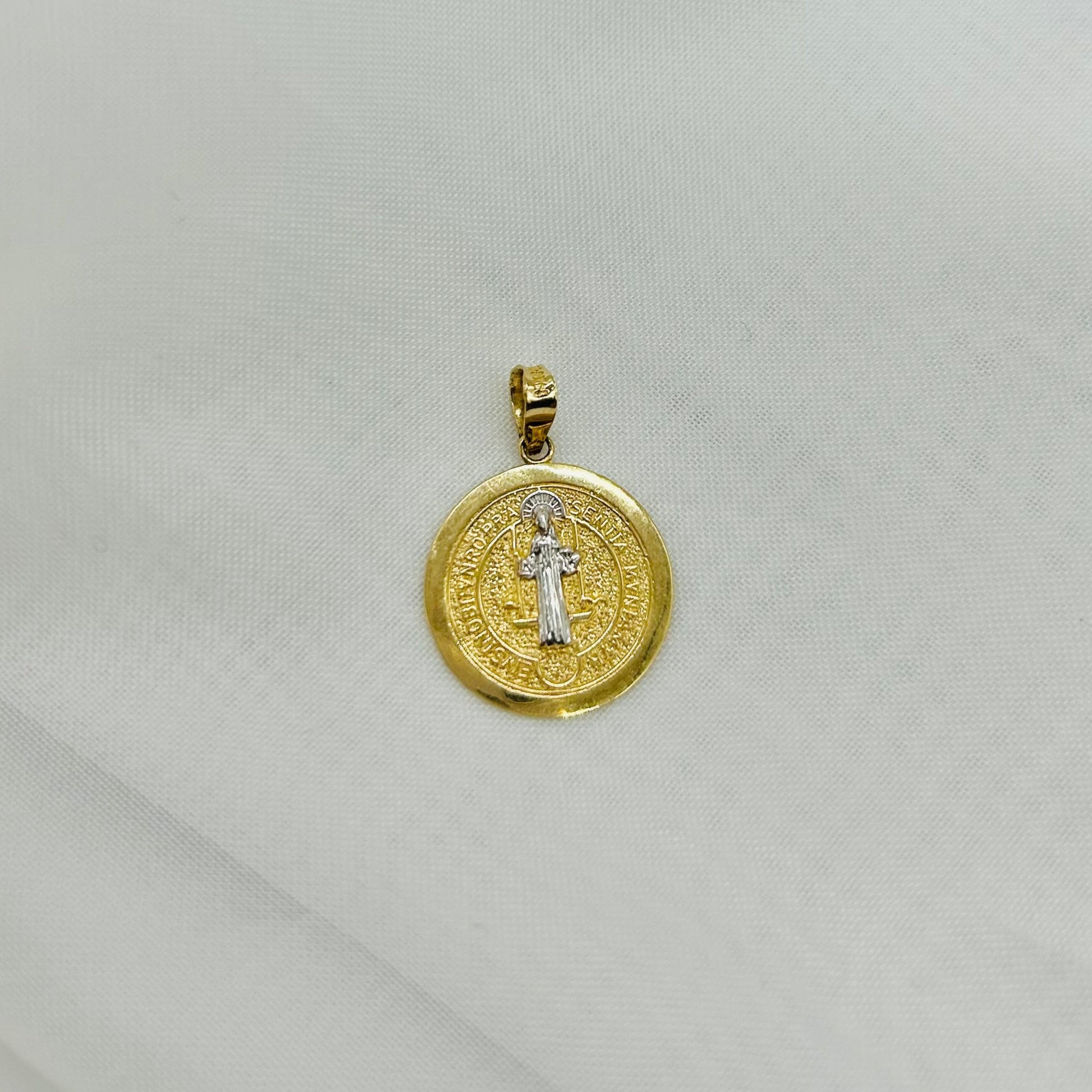 Hecho de oro 14k, este dije representa la fe y la protección de San Benito en dos elegantes lados. Una pieza única que te acompañará siempre.