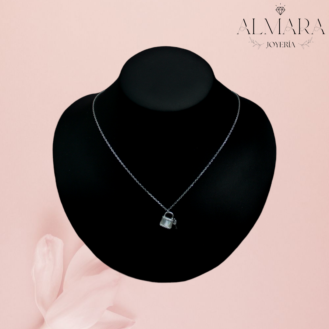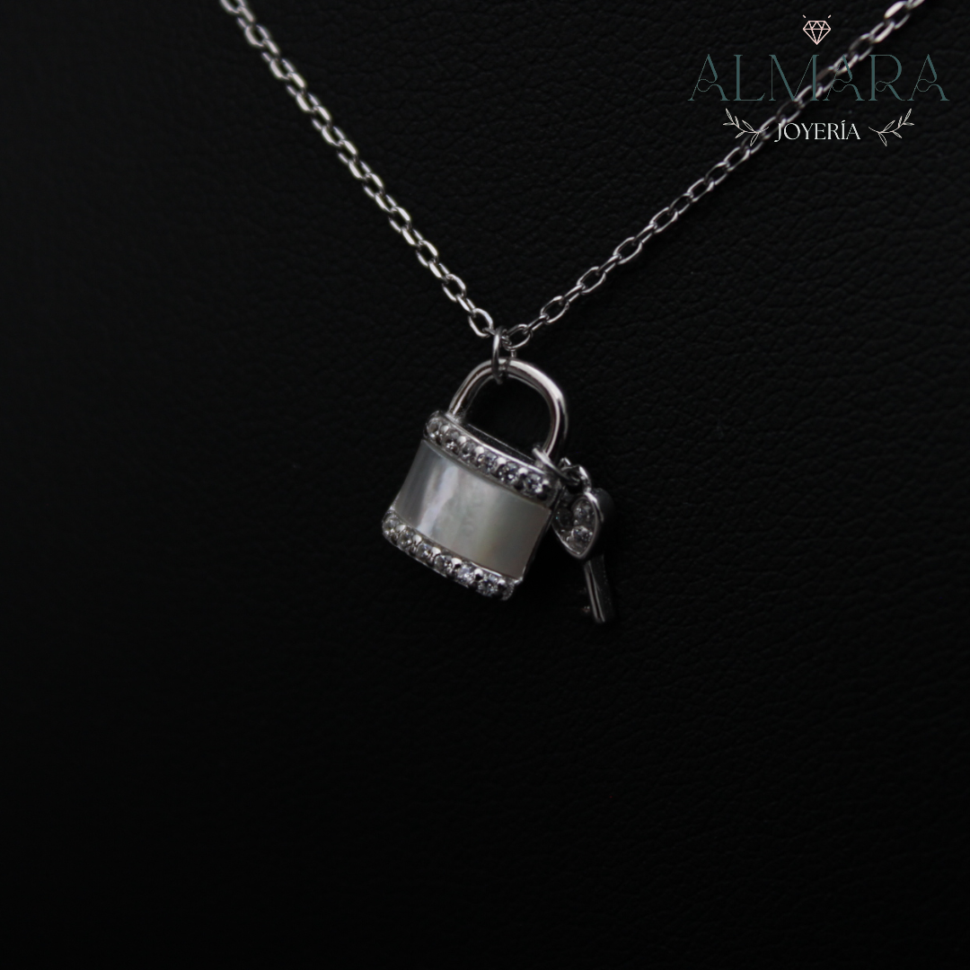 ¡Desbloquea el estilo con nuestra gargantilla de candado y llave! Con una concha nácar y zirconias que aportan brillo a la plata, ¡esta gargantilla seguramente robará corazones! ¡Agrega un toque de misterio y romance a tu atuendo con esta pieza única!