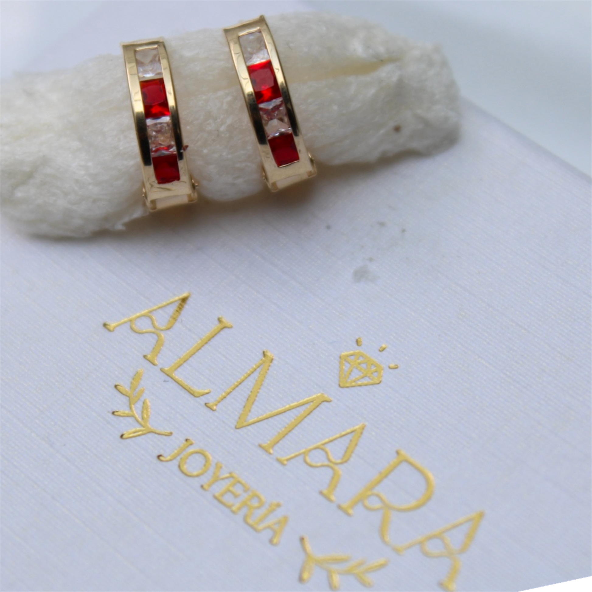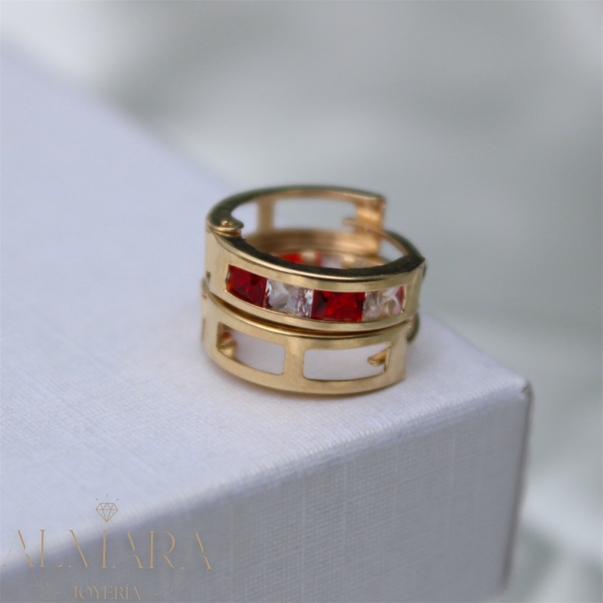 Huggies en Oro 10K con Zirconias Rojas y Blancas