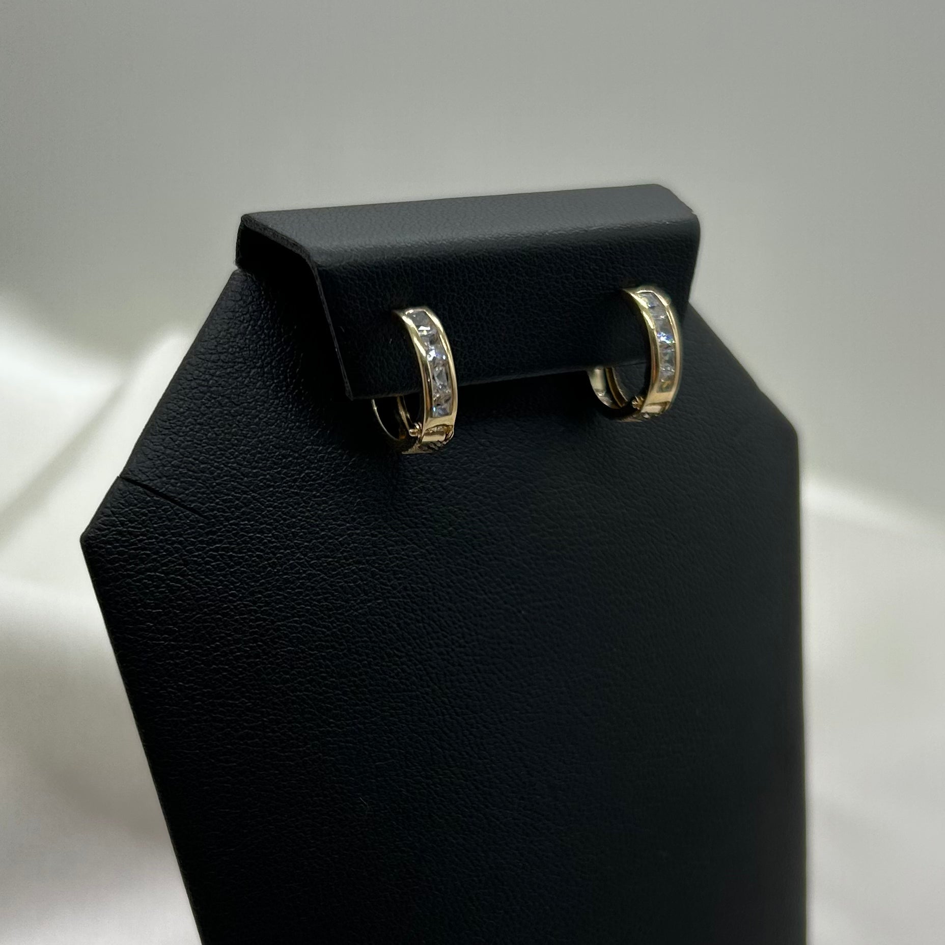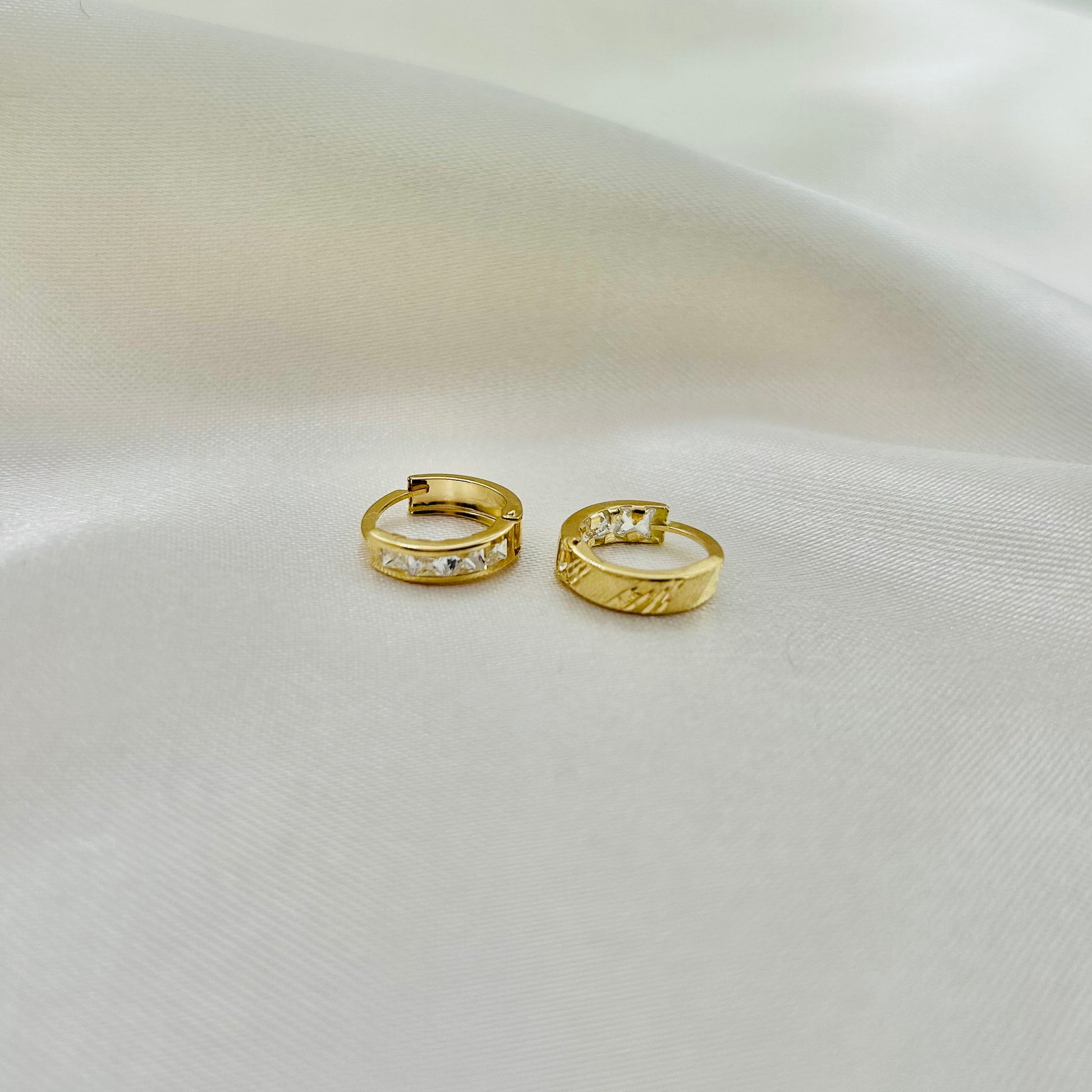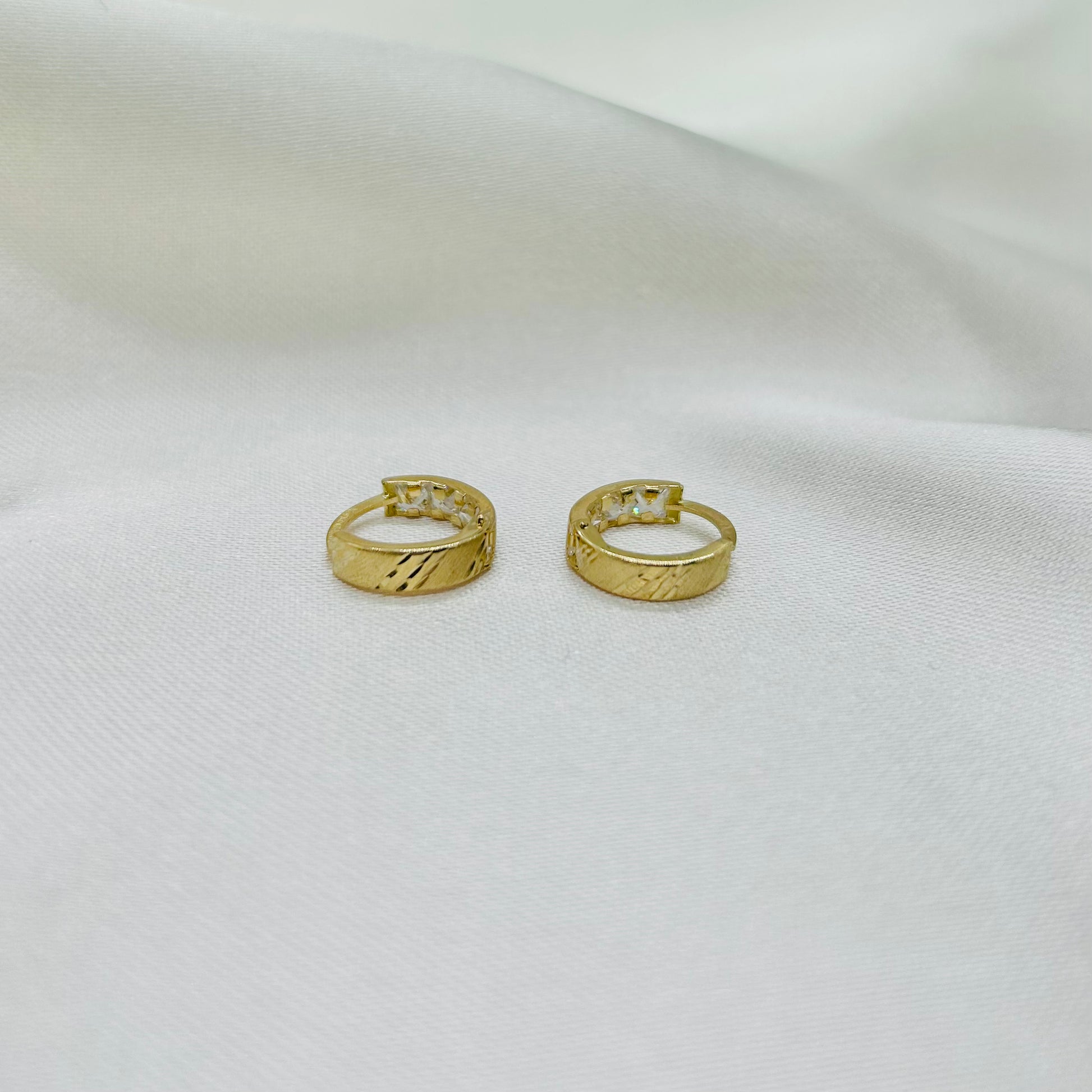Hermosos huggies doble vista con zirconias de un lado y diseño en otro en oro de 14K