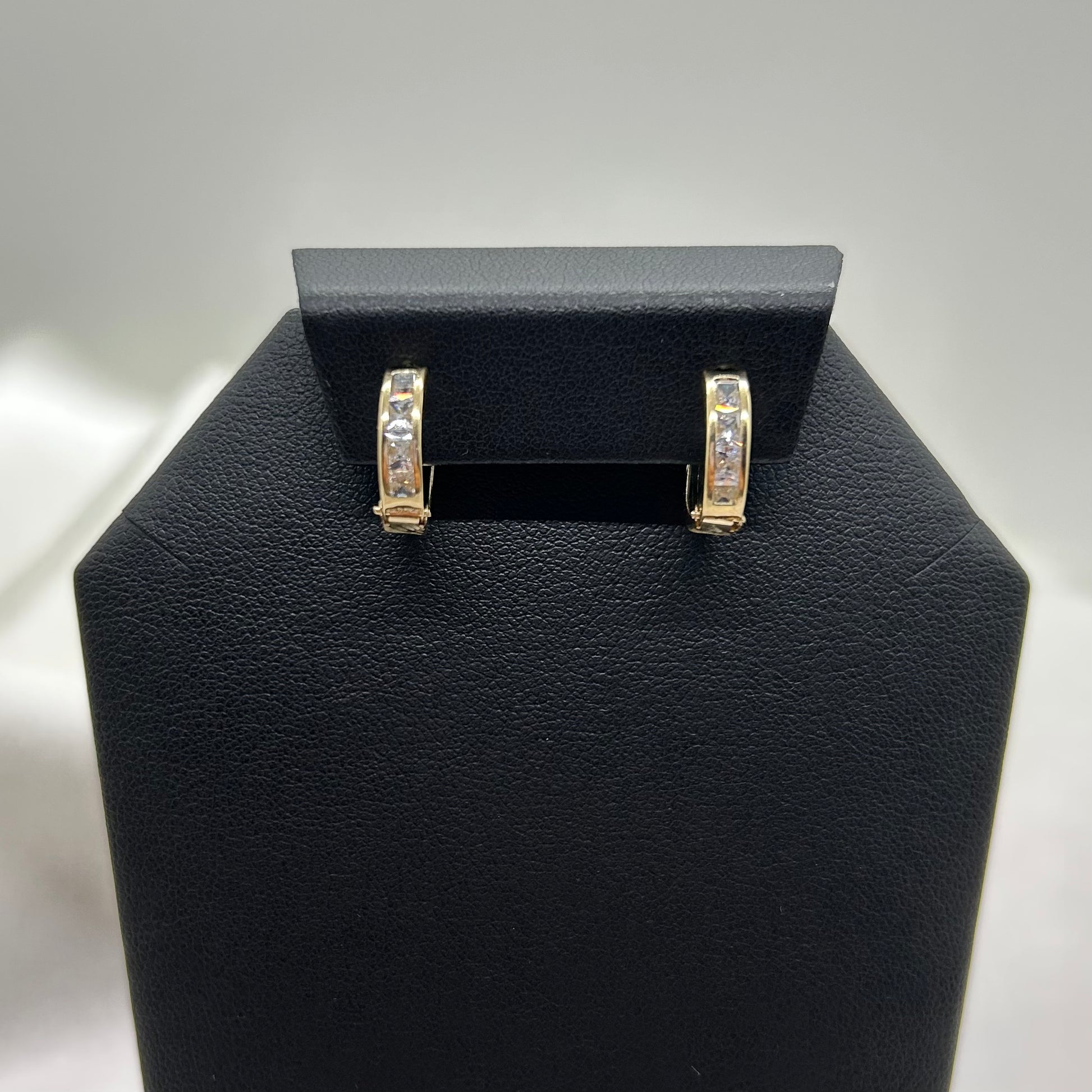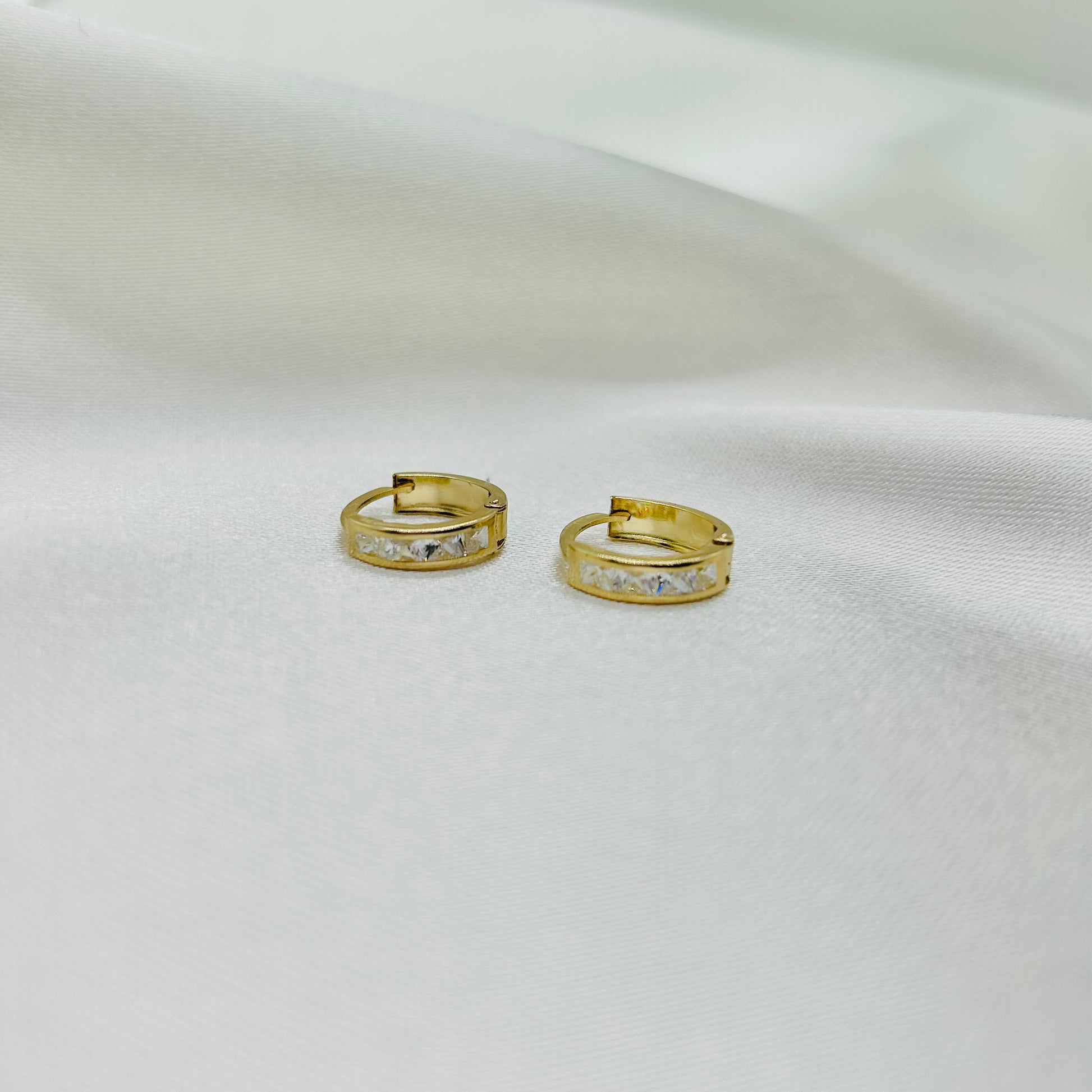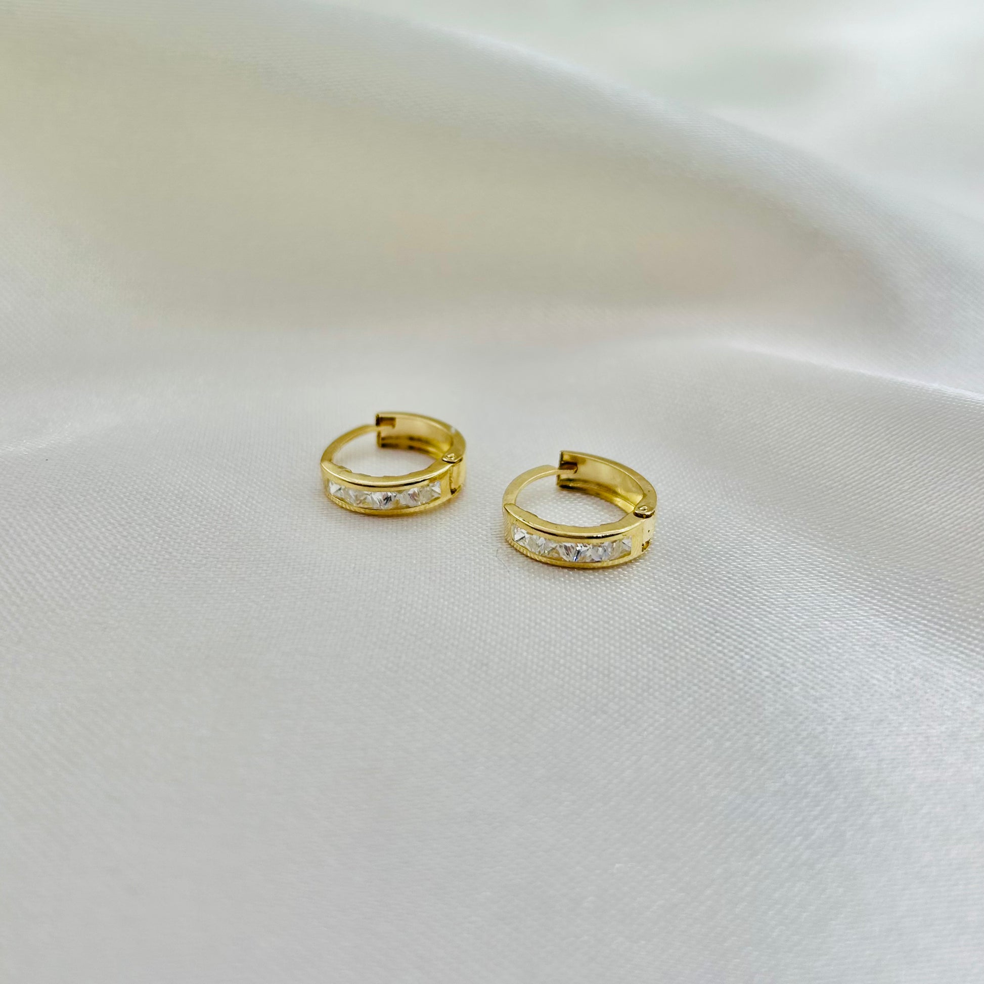 Hermosos huggies doble vista con zirconias de un lado y diseño en otro en oro de 14K
