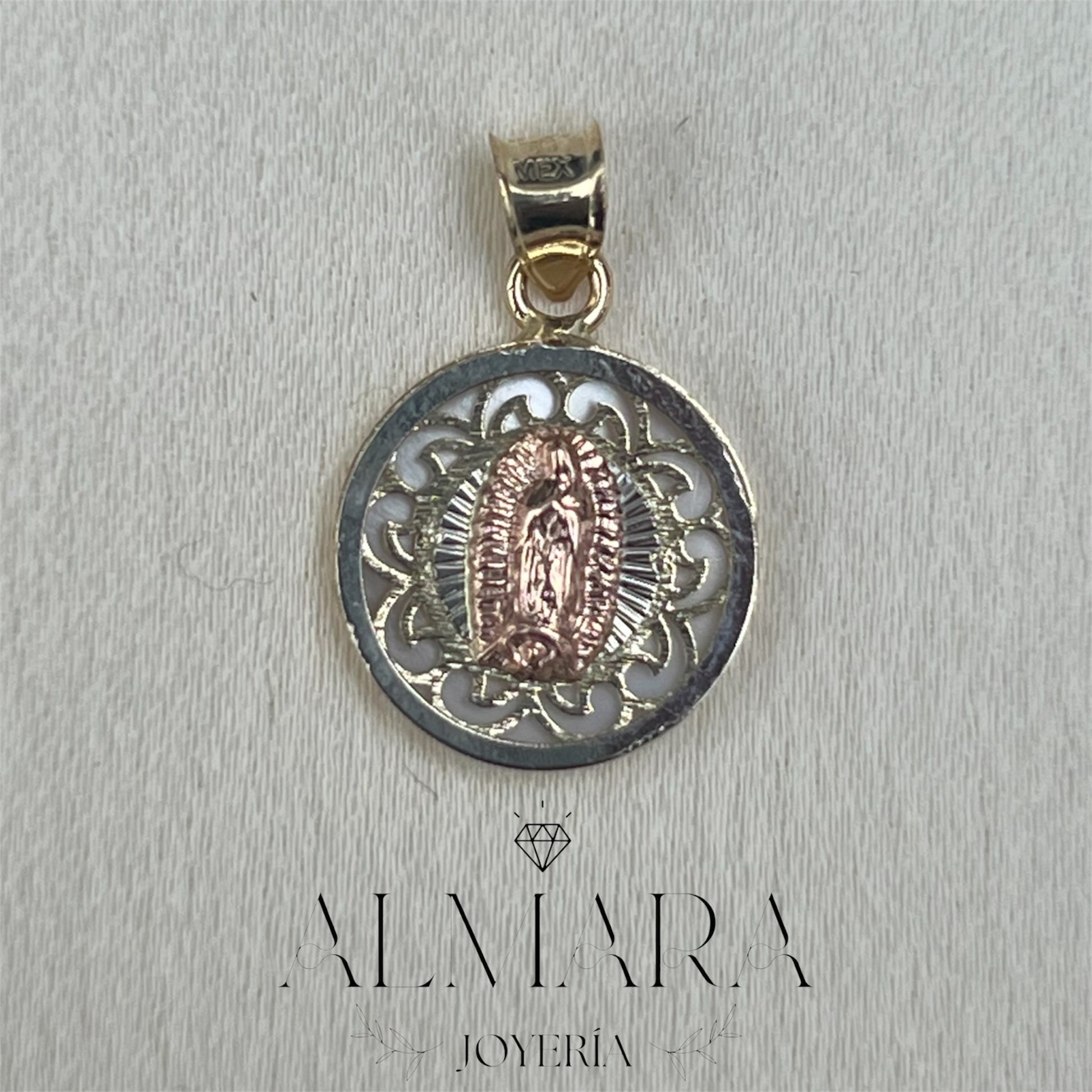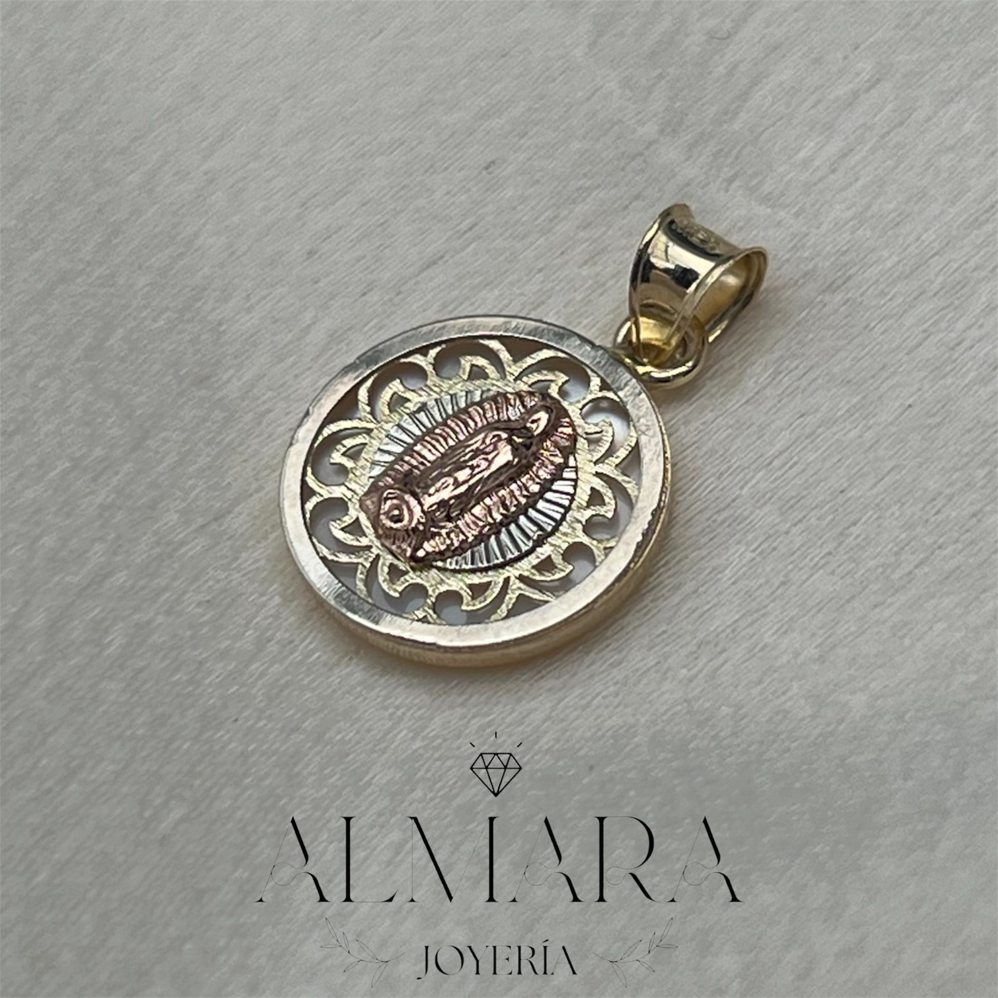Esta medalla de oro 10K combina dos tonos para resaltar la belleza y el detalle de la Virgen en su centro. El diseño filigranado añade un toque de elegancia, mientras que el contraste de colores crea una pieza única y significativa. Perfecta para quienes buscan una joya que combine devoción y estilo sofisticado.