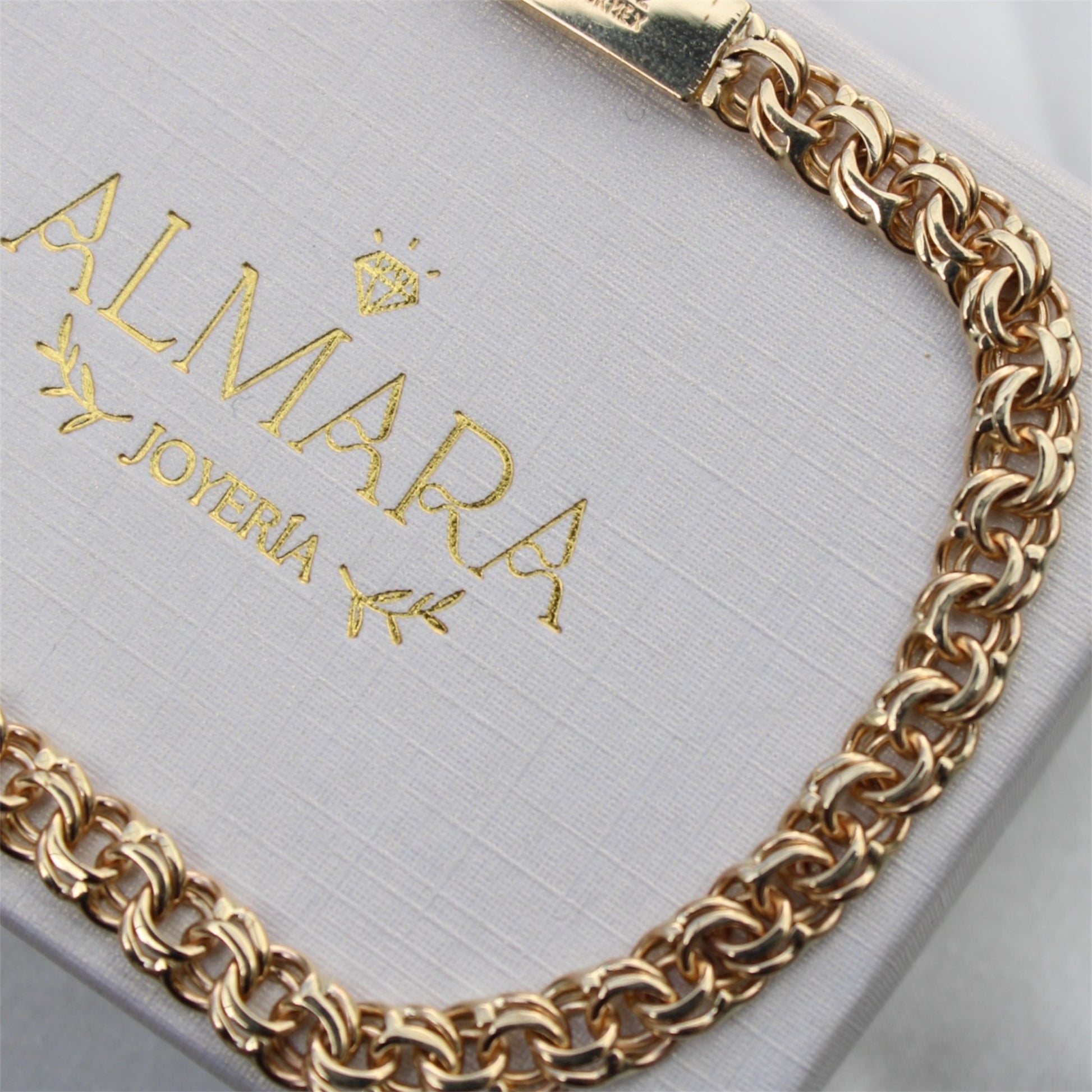 Esta imponente pulsera de tejido chino en oro 10K destaca por su diseño robusto y elegante, ideal para quienes buscan una joya con presencia y estilo. Sus eslabones entrelazados crean un patrón distintivo que brilla con cada movimiento, aportando un toque de lujo a cualquier look. Perfecta para quienes desean una pieza versátil y duradera, capaz de elevar cualquier ocasión.