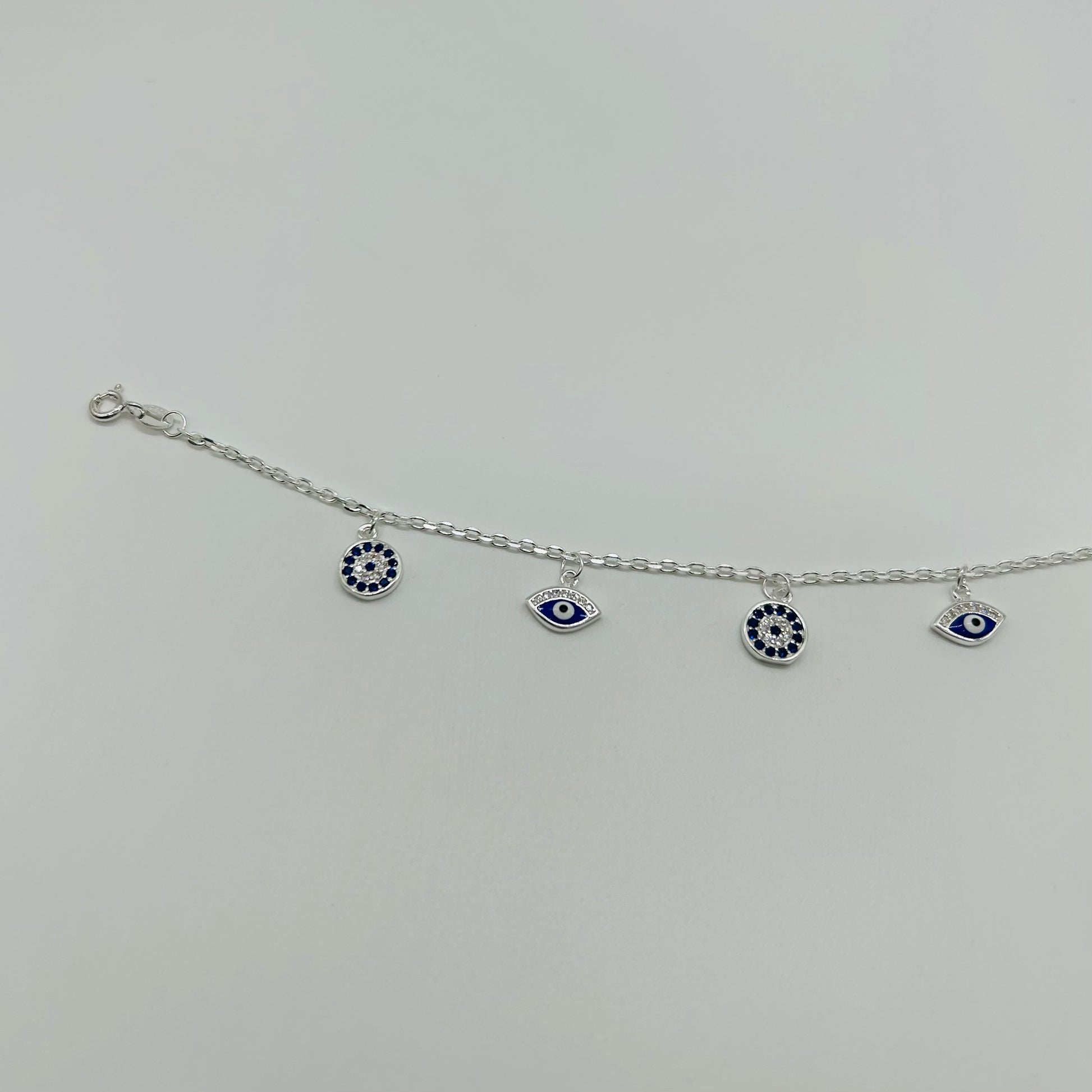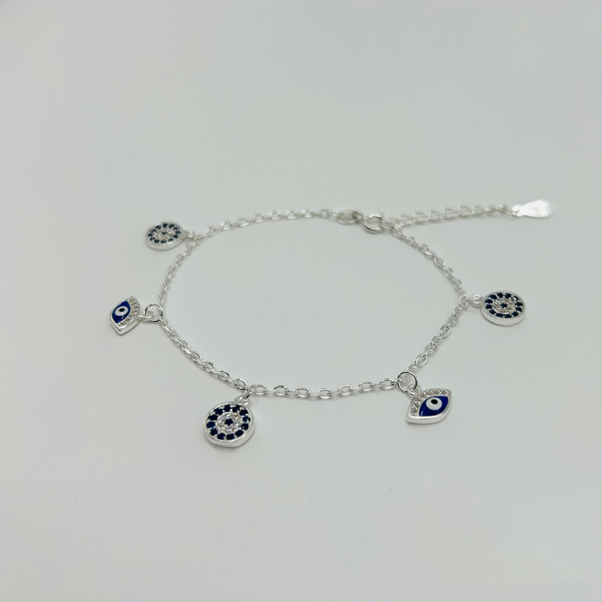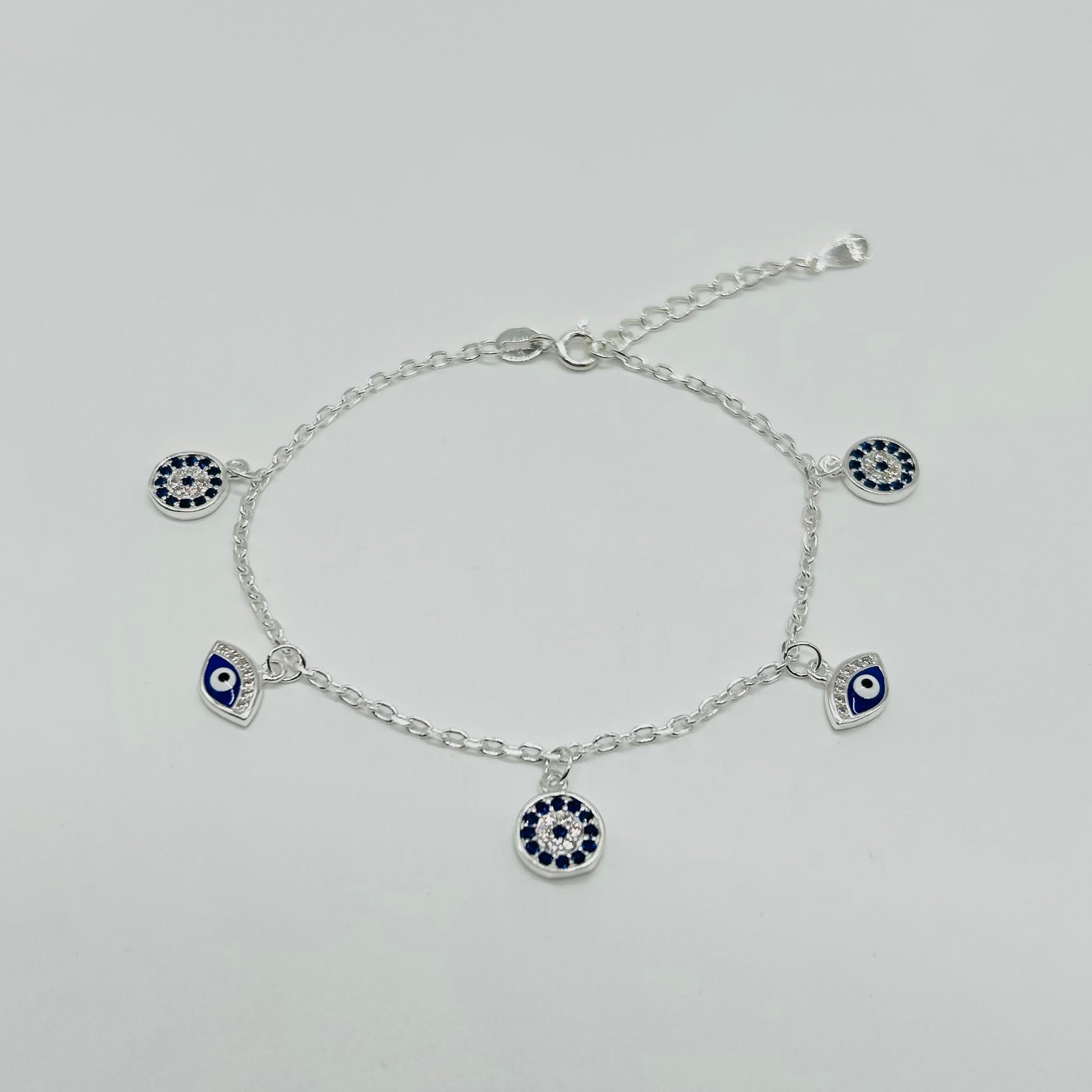 ¡Agrega un toque de protección y elegancia a tu estilo con nuestra pulsera de ojitos turcos azules! Hecha de plata y adornada con zirconias brillantes, esta pulsera no solo es hermosa, sino también simboliza la buena suerte y la protección contra el mal de ojo. ¡Un accesorio imprescindible para cualquier ocasión!