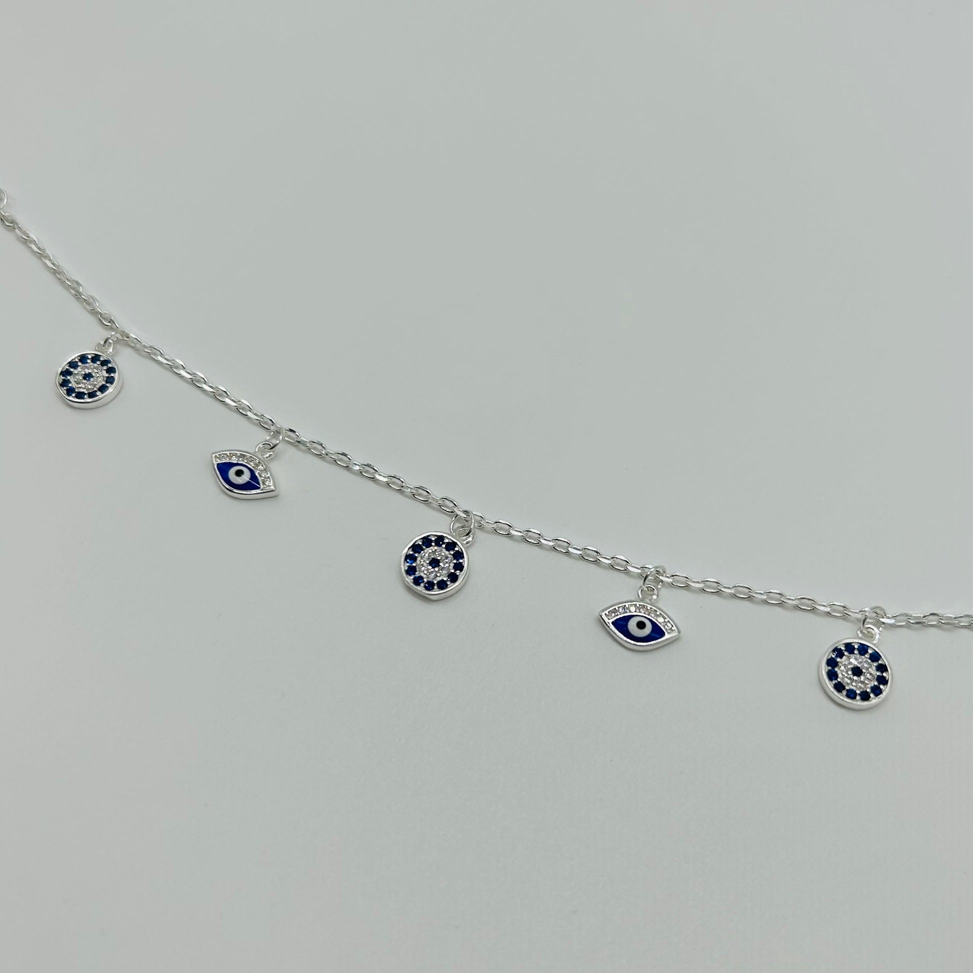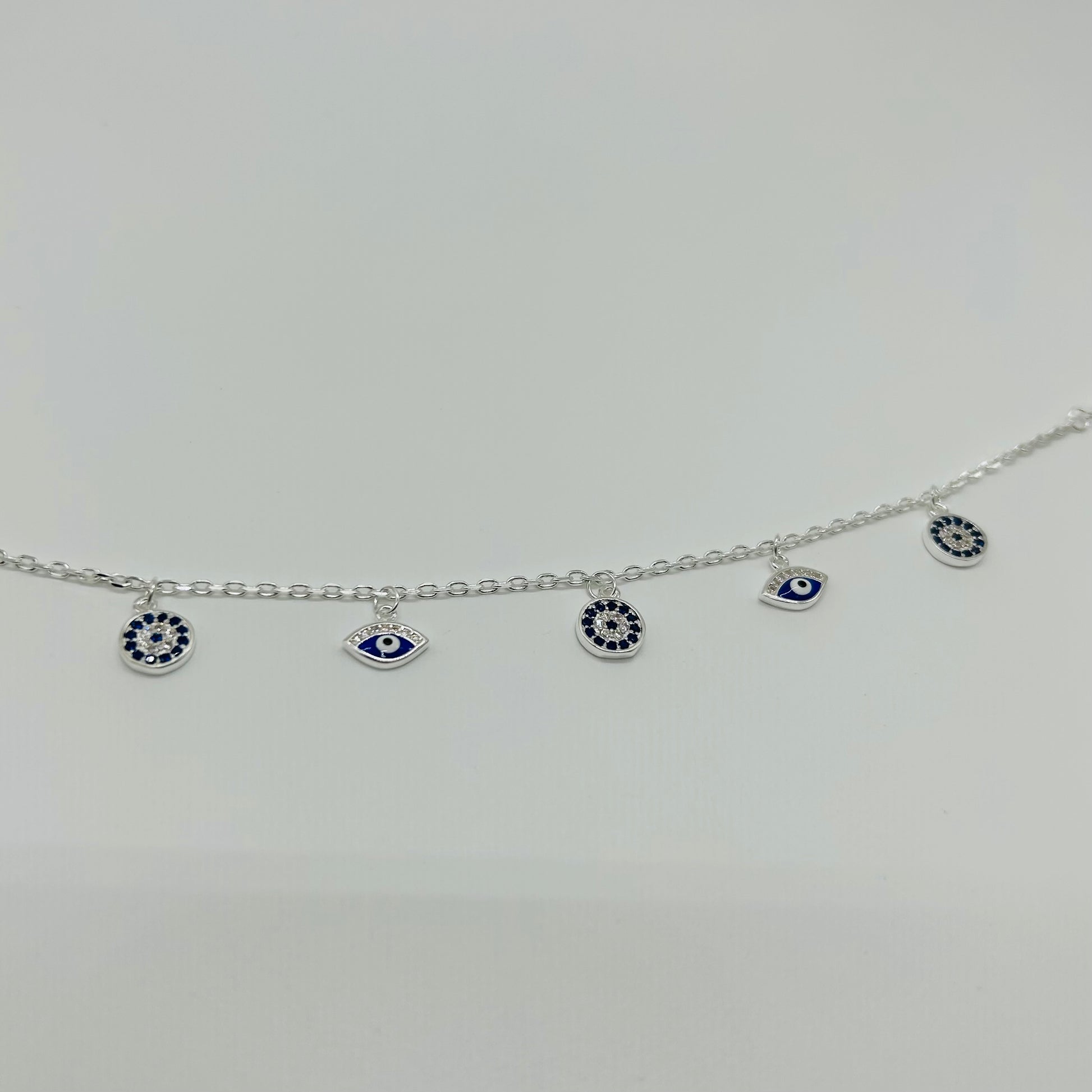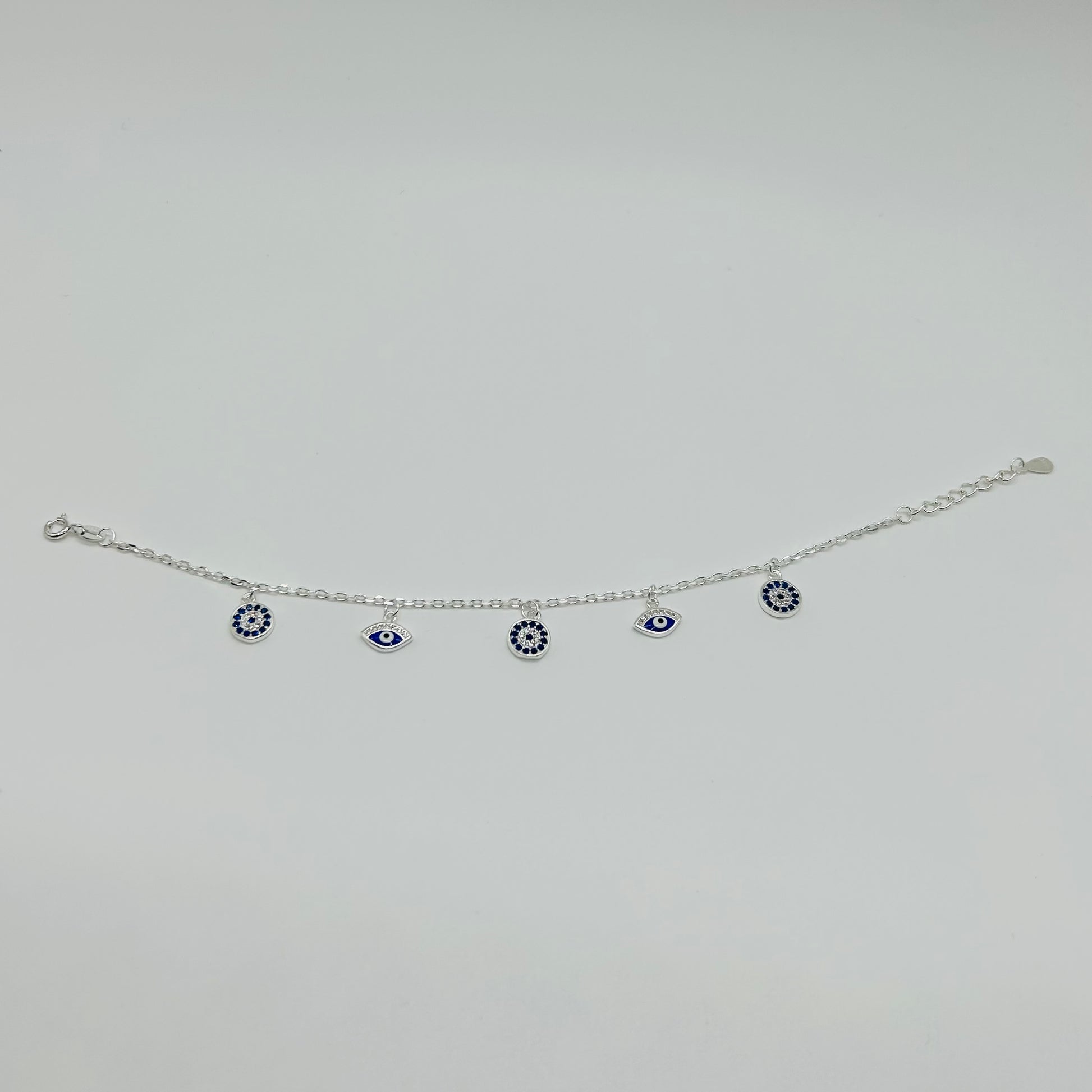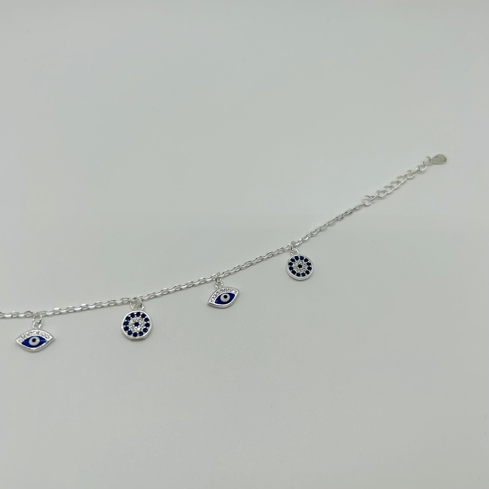 ¡Agrega un toque de protección y elegancia a tu estilo con nuestra pulsera de ojitos turcos azules! Hecha de plata y adornada con zirconias brillantes, esta pulsera no solo es hermosa, sino también simboliza la buena suerte y la protección contra el mal de ojo. ¡Un accesorio imprescindible para cualquier ocasión!