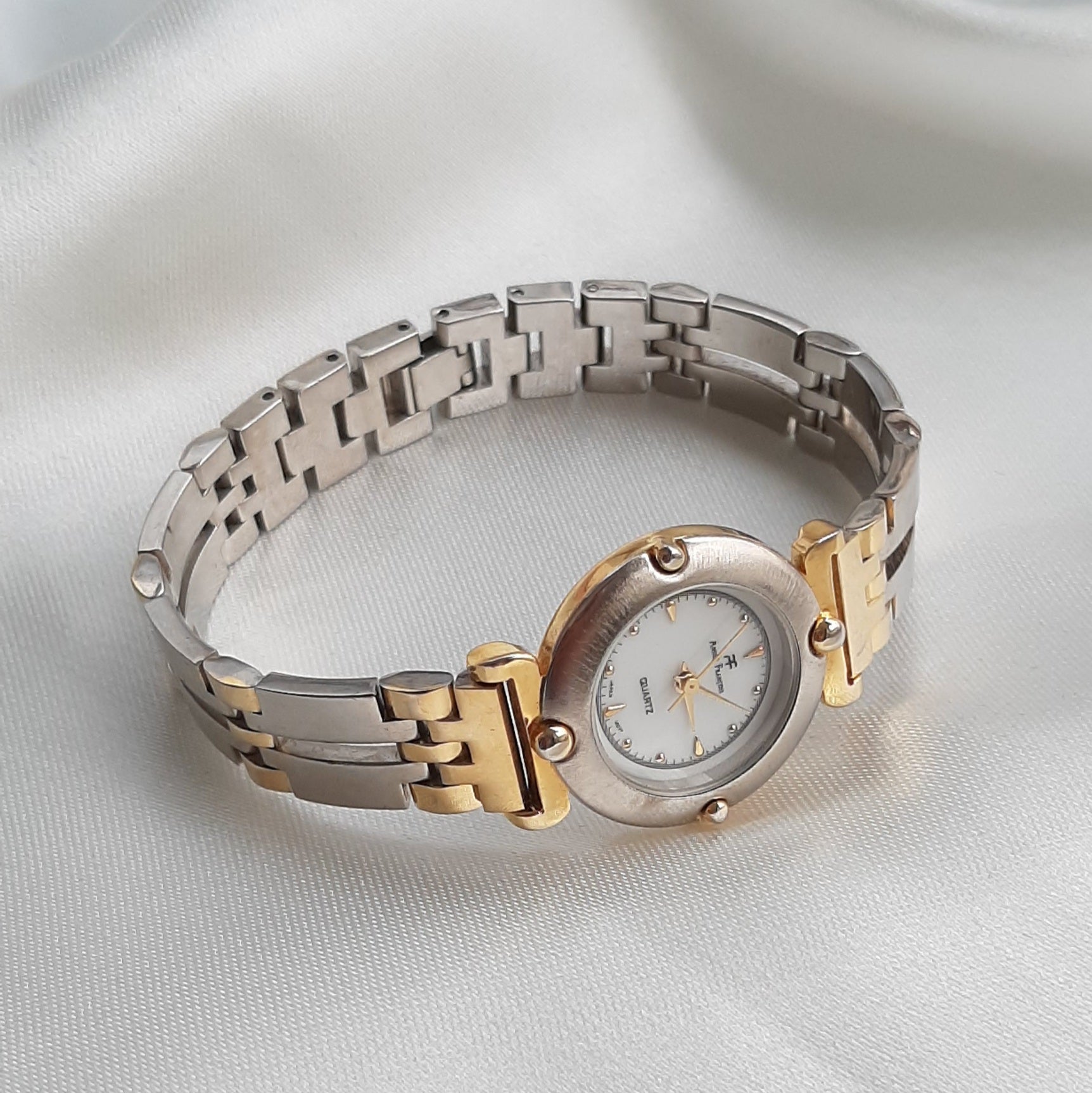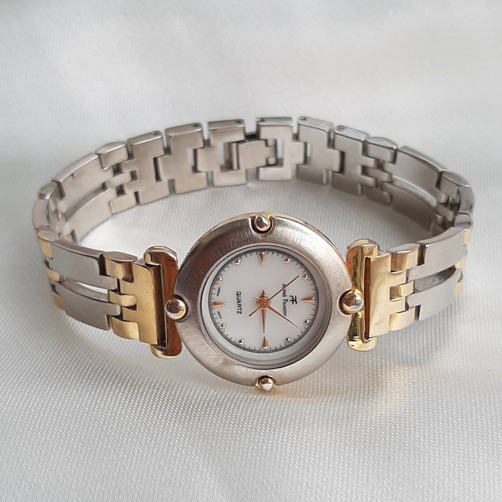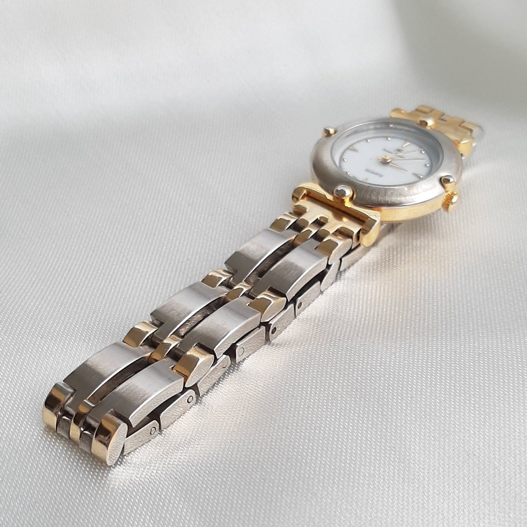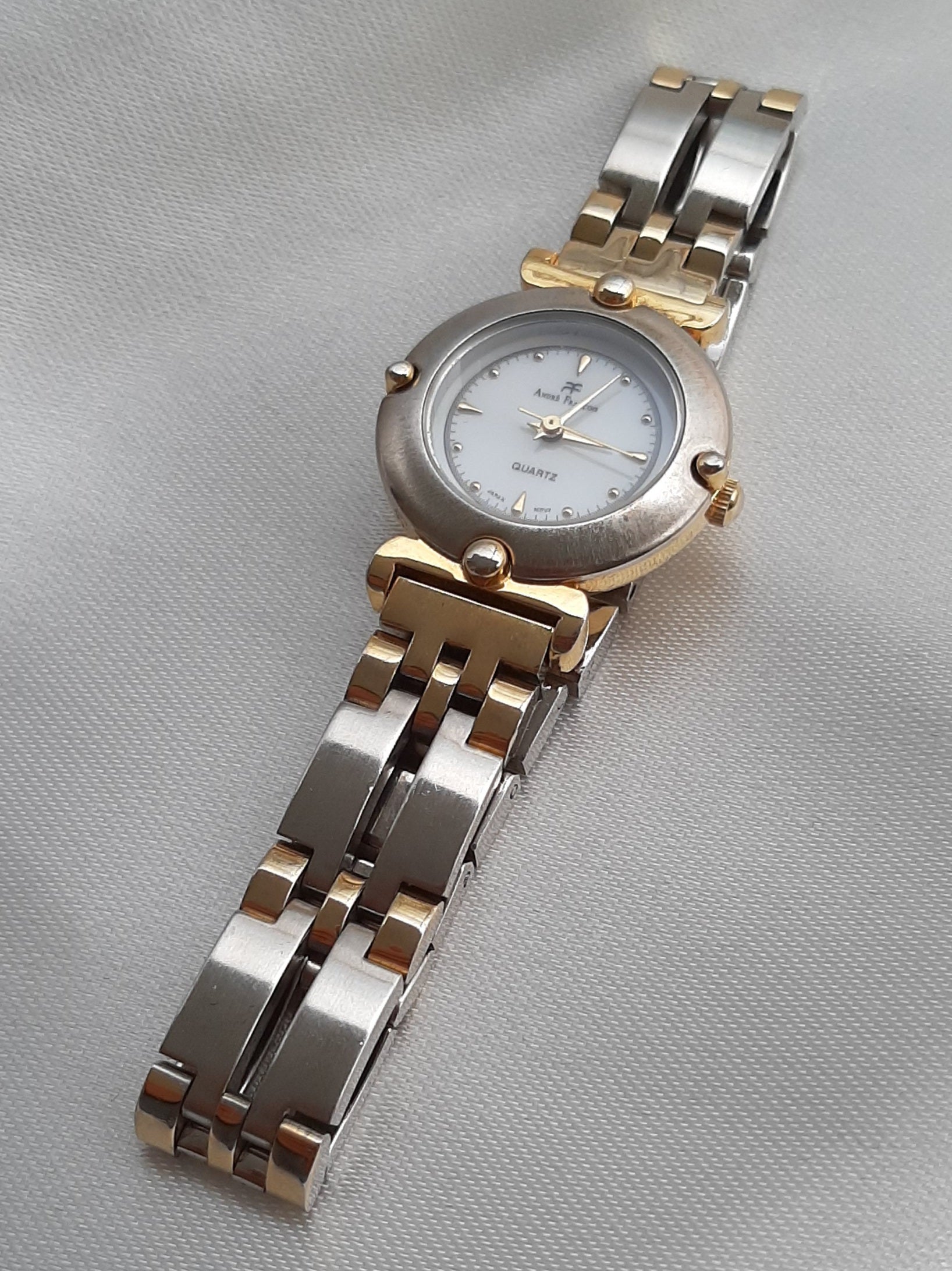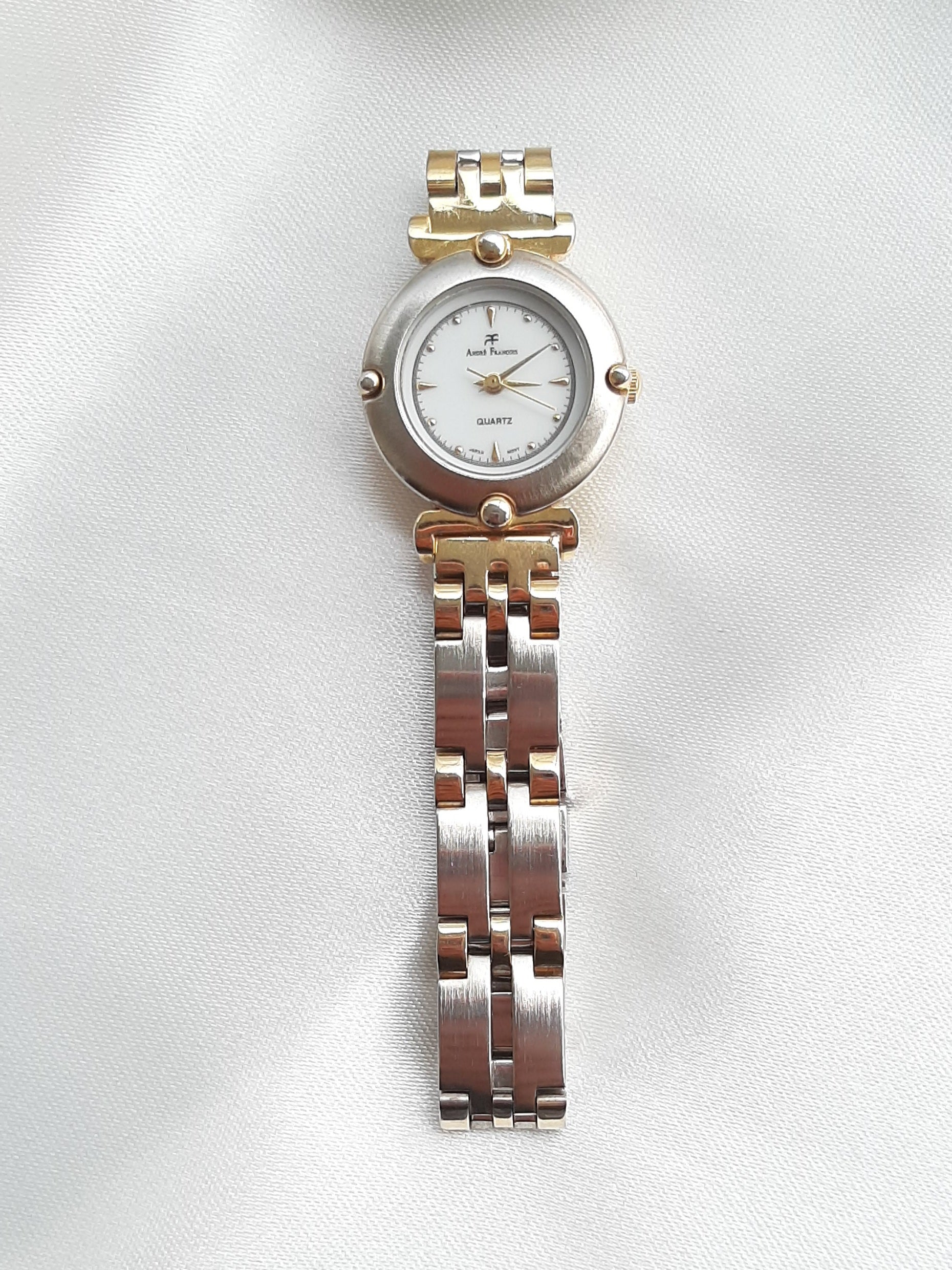 Hermoso reloj de acero inoxidable en tonos dorado y plateado, de cuarzo, de pila.